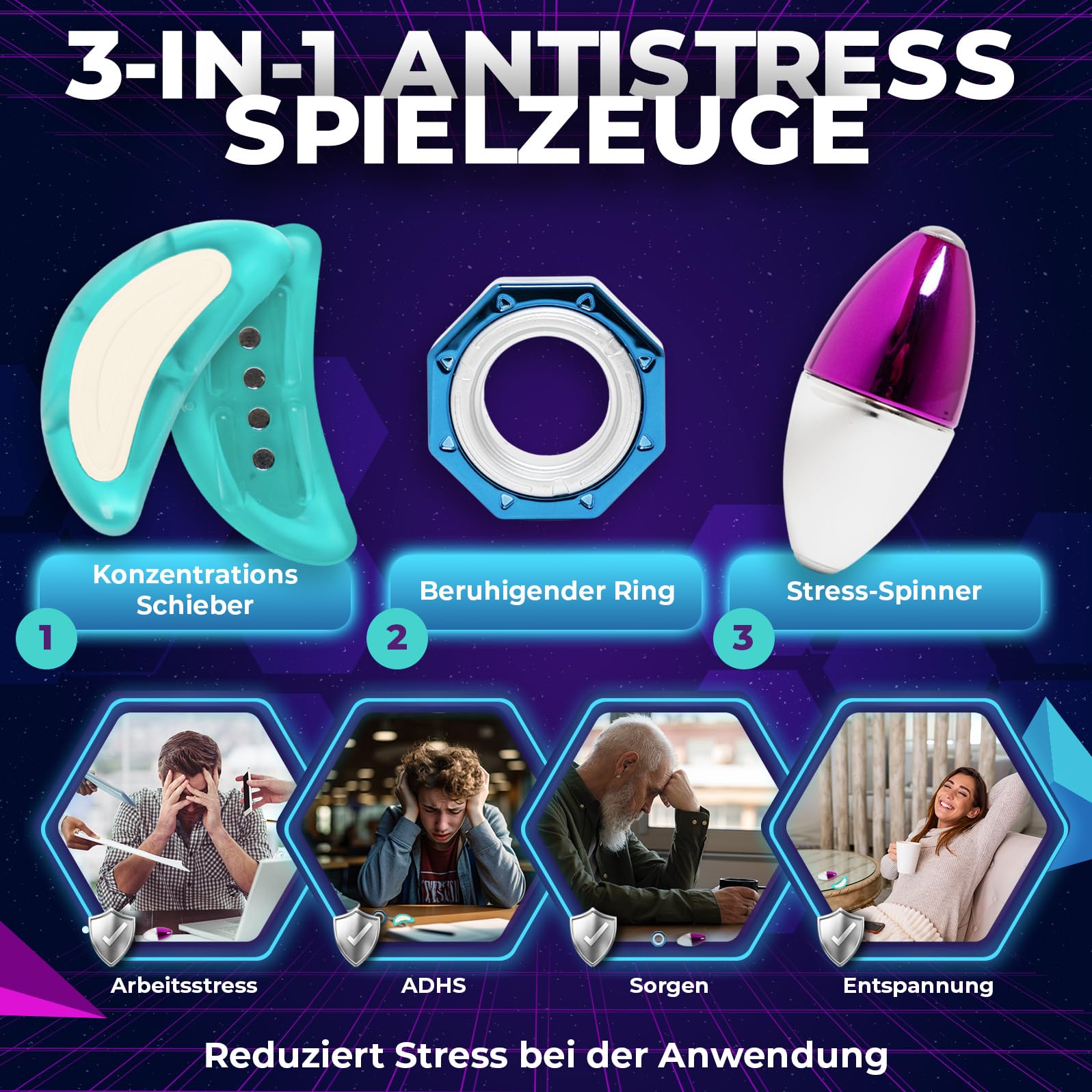 - ✅ ENDLICH RUHE FINDEN: Dein 3-in-1 Anti-Stress Set ist die Antwort auf den Alltagsdruck. Fühle, wie die Sorgen weichen und innere Gelassenheit einkehrt – für mehr Fokus im Büro, beim Lernen oder Gaming.