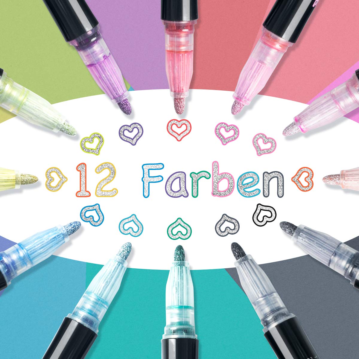 • 🎄🎈12 Besondere Stifte🎈🎄: Glossy Stifte haben ein Spezielles Design: ① Wenn Sie auf hellem und weißer seiten schreiben, können Sie doppellinien gleichzeitig zeichnen, glitzer silber mit farbigem umrandung ② Auf dunkle / schwarzes papier malen, zeigt es nur metallic silber ③ wenn Sie auf einer glatten Oberfläche bemalen, die malstifte zeigt es nur die bunte Farbe. Das magische stifte es ist ein coole sachen für kleine geschenke adventskalender füllung ideen