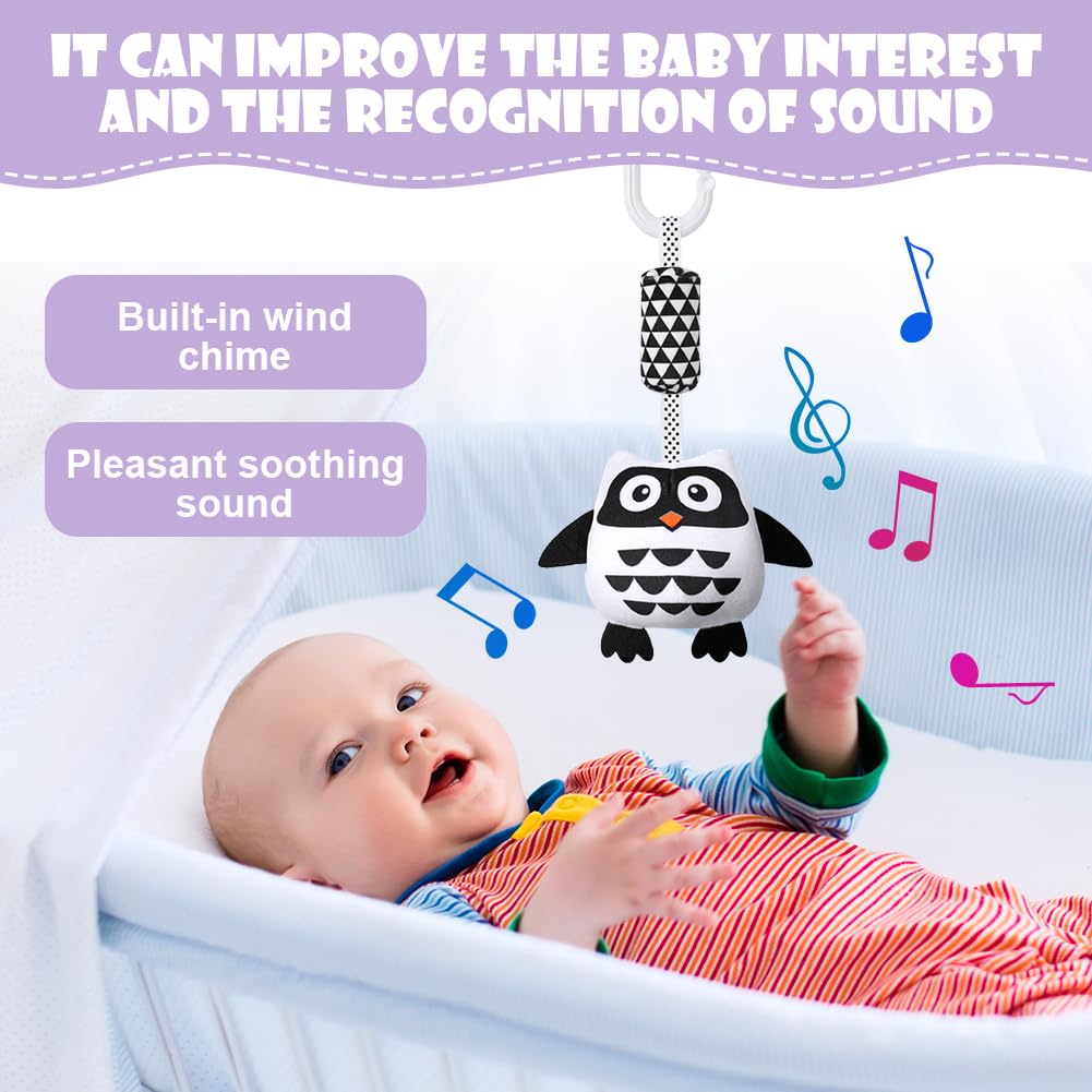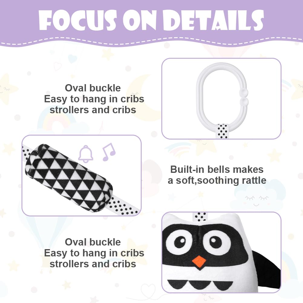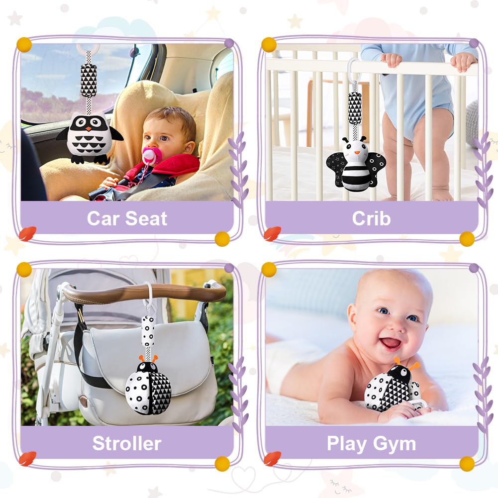 - ♫ 【Schwarz-weißes Entwicklungsspielzeug】 Visuelle und akustische Reisespielzeuge sind Spielzeuge, die für Neugeborene geeignet sind, während schwarz-weiße Kinderwagenspielzeuge eine der effektivsten Möglichkeiten sind, die Sehkraft von Neugeborenen zu stimulieren. Verschiedene Tiermuster entwickeln und stimulieren die Sehfähigkeit des Babys.