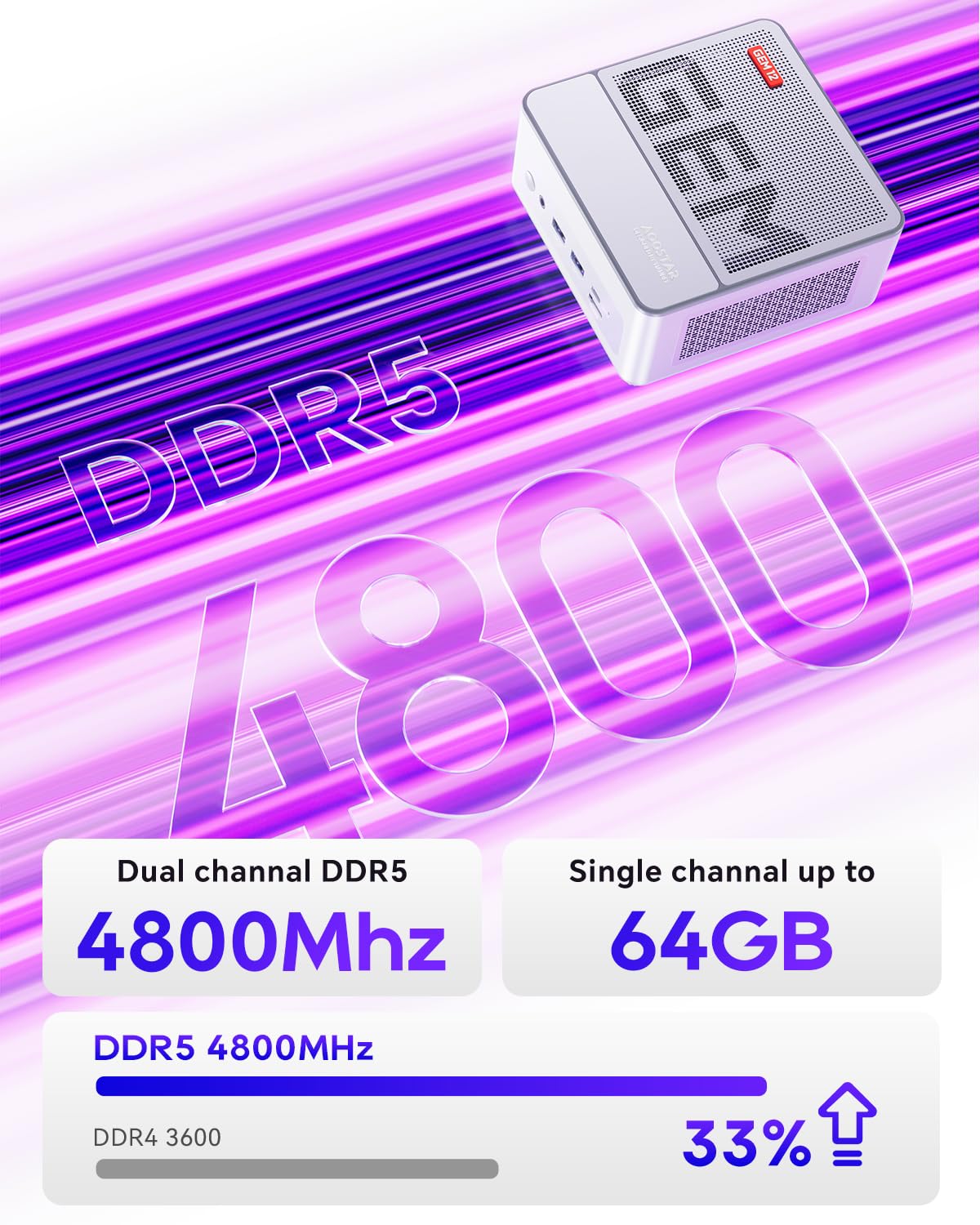 - 【Mehr Speichererweiterung】 Der AOOSTAR GEM12 6900HX Mini-Tower-PC verfügt über 32 GB DDR5-RAM (2 x 16 GB, 4800 MHz), Dual-Channel-DDR5 kann auf 128 GB (2 x 64 GB) aufgerüstet werden. DDR5-Speicher läuft 35 % schneller als DDR4, was ein effizienteres und flüssigeres Gameplay ermöglicht. Ausgestattet mit 1 TB NVME SSD, Dual M.2 2280 PCIe 3.0/4.0 Steckplätzen, Erweiterung max. 8 TB