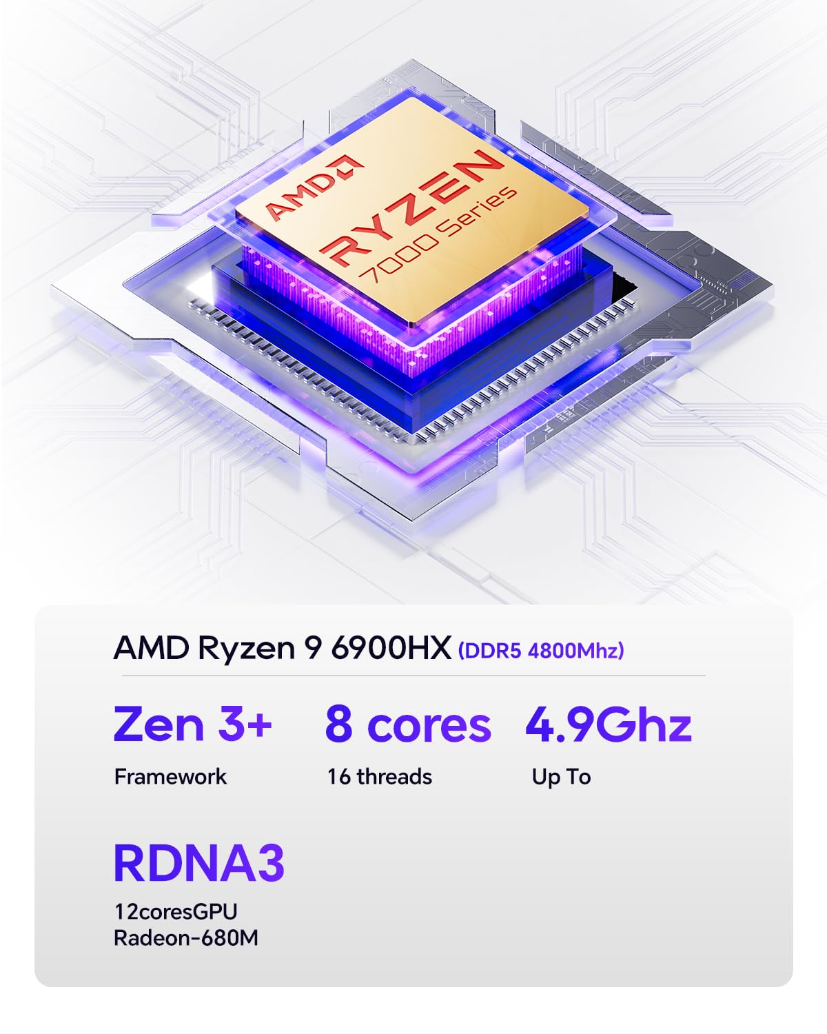 - 【Ausgezeichneter Zen 3+ AMD R9 6900HX Mini-PC】 Der AOOSTAR GEM12 Mini-Computer wird von AMD Ryzen 9 6900HX angetrieben. Die Basisfrequenz beträgt 3,3 GHz / die dynamische Frequenz kann 4,9 GHz erreichen. Verfügt über revolutionäre 6-nm-Technologie, MAX 75 W TDP (dreistufig einstellbares BIOS) und eine um 21 % höhere Verarbeitungsleistung im Vergleich zum AMD R7 7735HS. Es ist ideal für AAA-Spiele, Bildbearbeitung (CAD, PS, Pr, Ai), Bürosoftware, kreatives Design, Programmierung, HTPC/Zoom-Konferenzen/Skype und mehr!