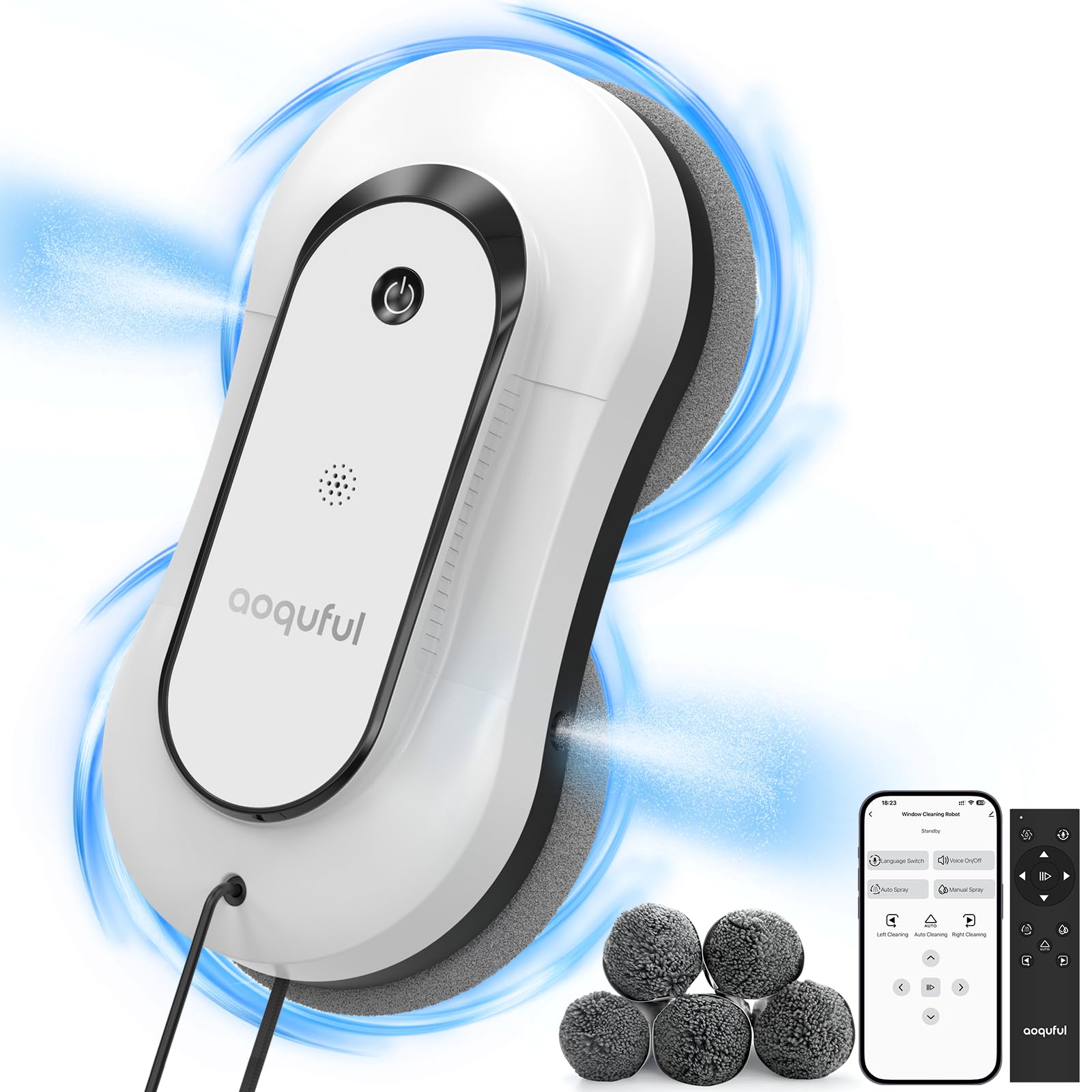AOQUFUL intelligenter Fensterputzroboter, elektrischer Fensterputzer mit Dual-Wasserspray, automatischer Fensterroboter mit Fernbedienung und App, für Innen- und Außenfenster und Glas,12 Tücher, weiß