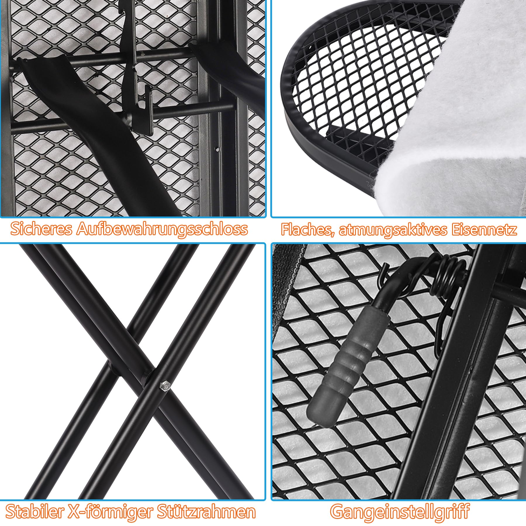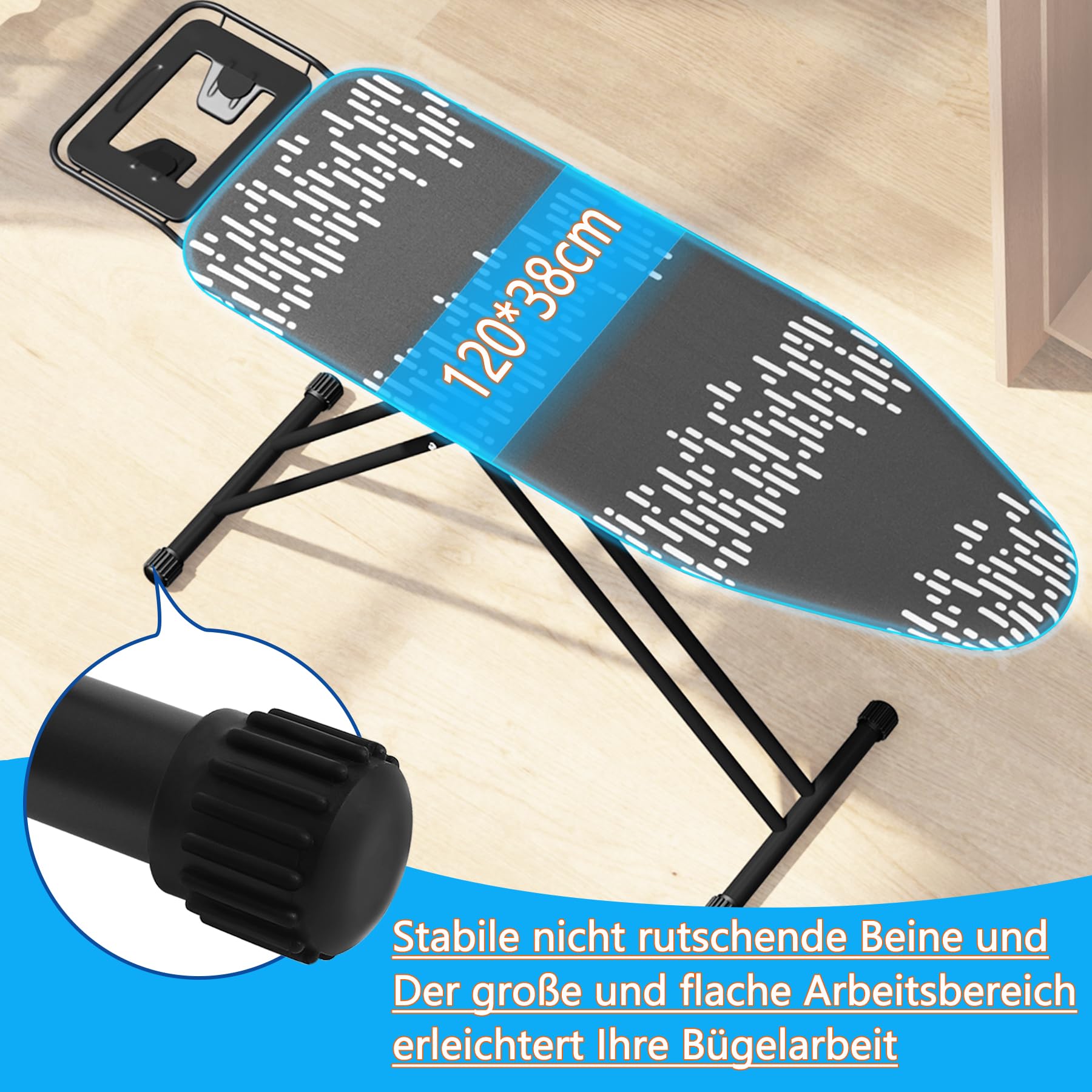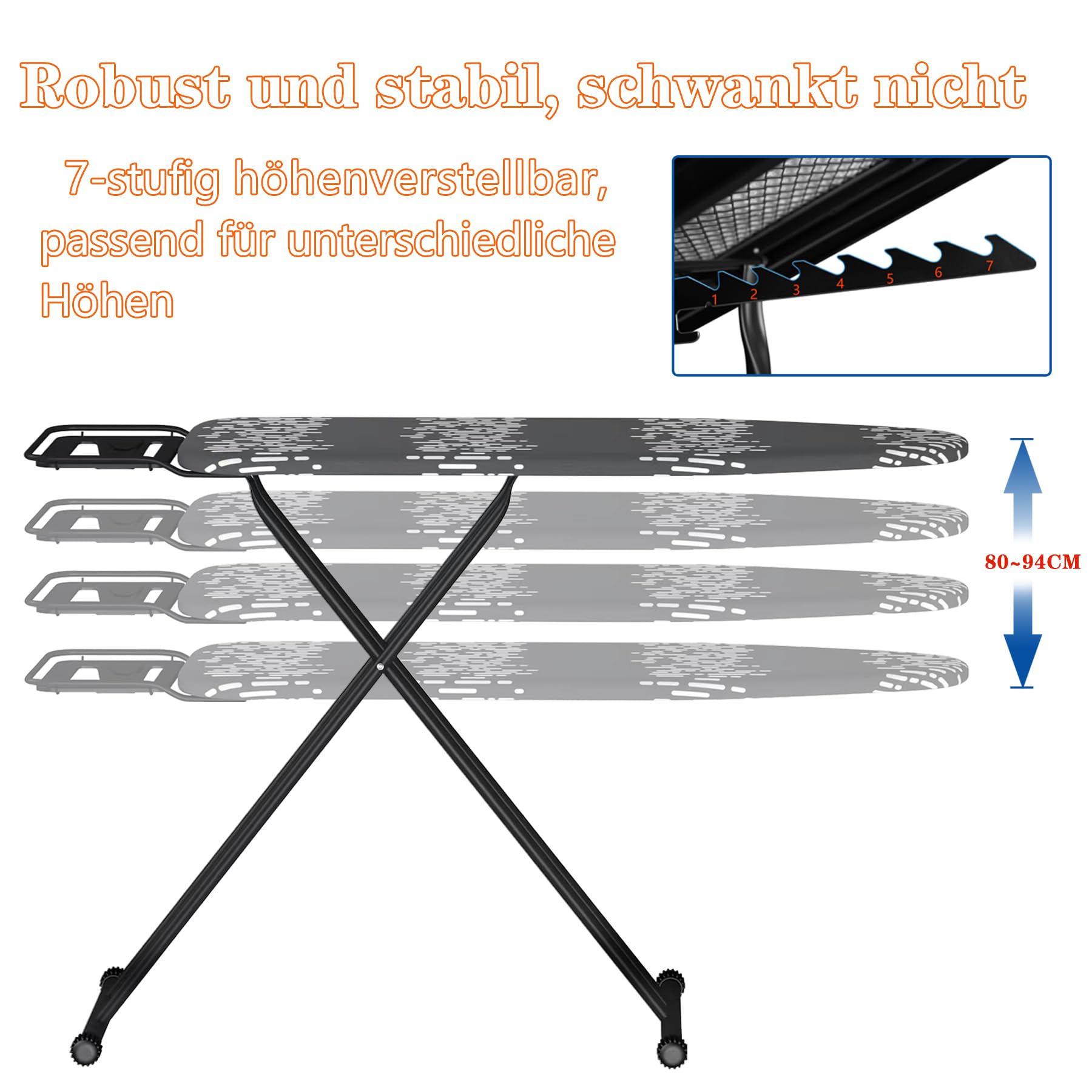 - Stabile Konstruktion: Das Gestell ist aus robustem Metall gefertigt und bietet eine sichere Standfestigkeit während des Bügelns.