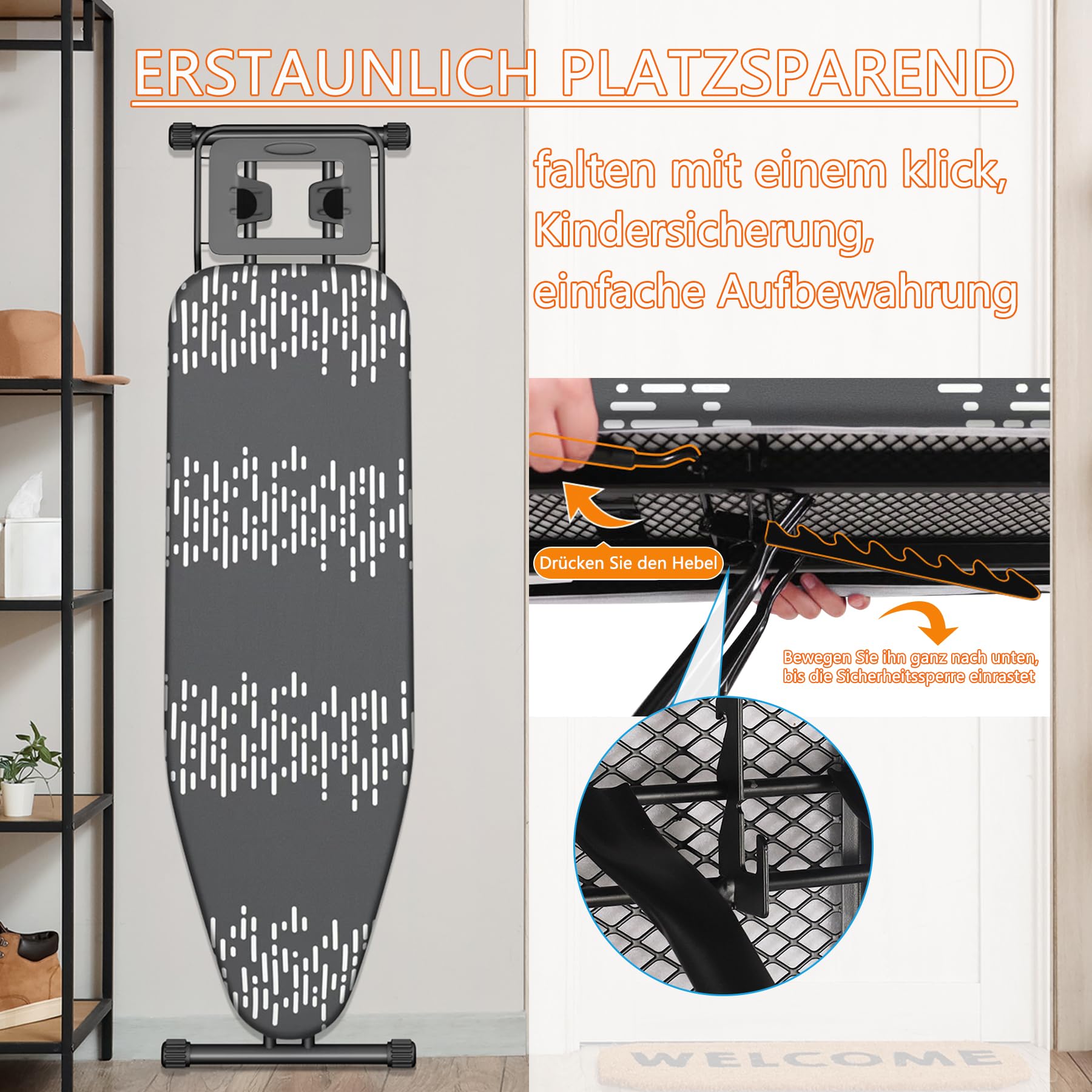 - Platzsparendes Design: Das kompakte Bügelbrett lässt sich leicht verstauen und eignet sich ideal für kleine Wohnungen oder beengte Räume.