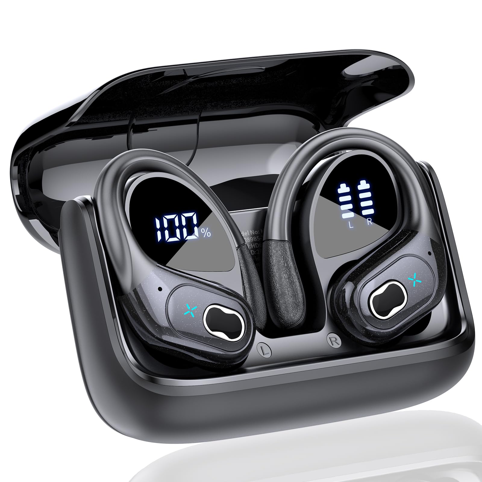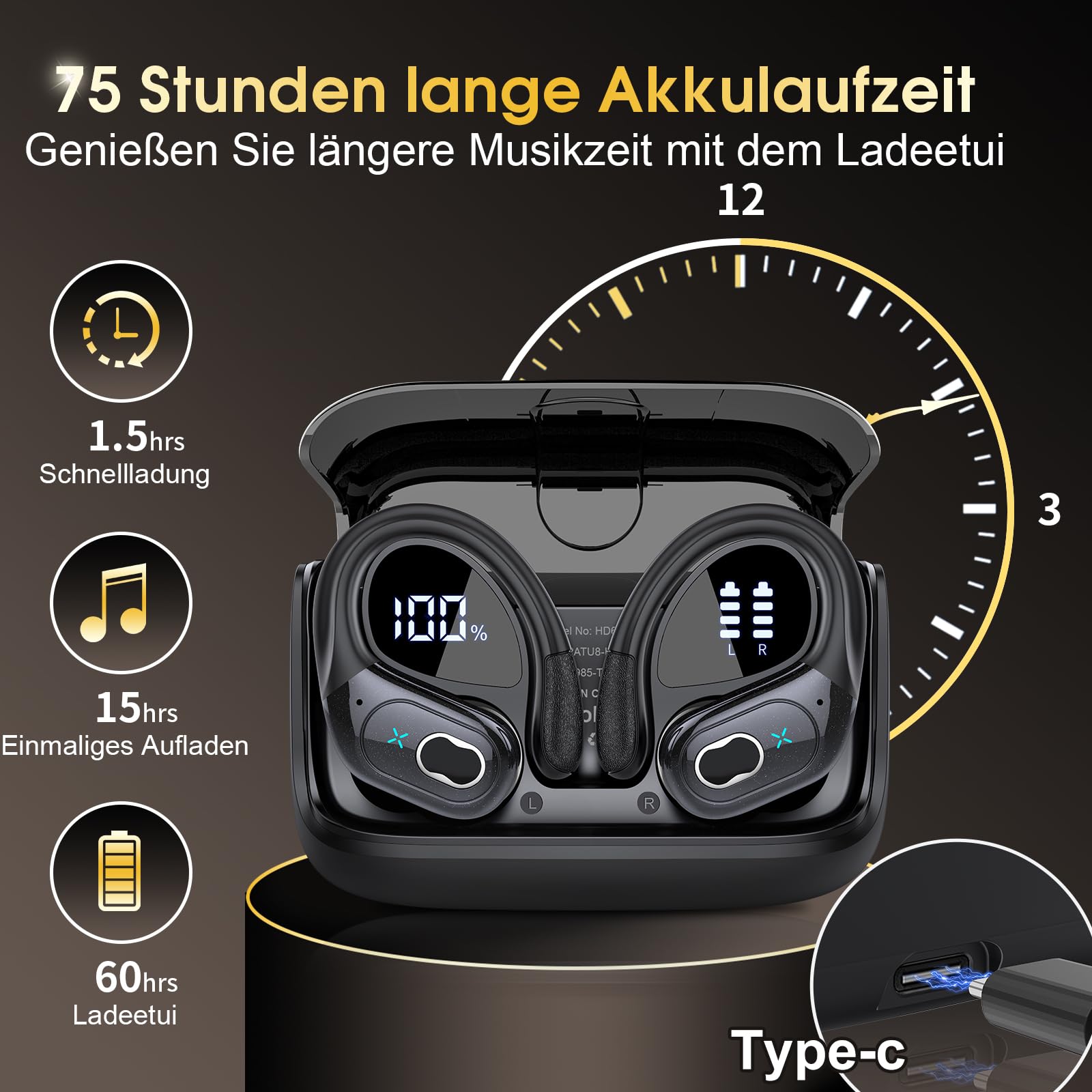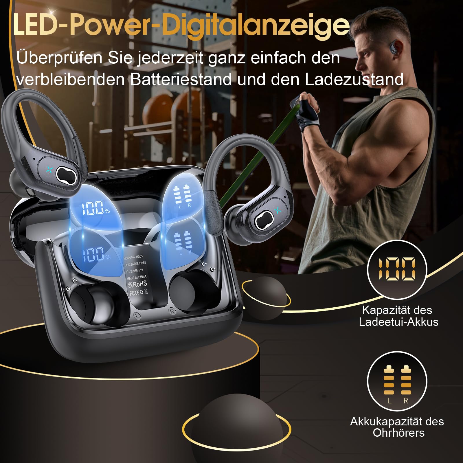 - Hoher Tragekomfort und IPX7-Wasserdicht: Die sport kopfhörer bluetooth sind mit drei verschiedenen Ohrstöpselgrößen (S/M/L) ausgestattet. Die Ohrstöpsel verfügen über ein innovatives weiches Ohrbügeldesign, das sich vollständig der Kontur Ihres Ohrs anpasst. Sie können sie lange tragen, ohne Beschwerden zu verspüren. Die IPX7-wasserdichte Funktion schützt die Kopfhörer leicht vor leichten Regentropfen oder Schweiß und macht sie ideal für das Laufen, Training, Fitnessstudio und Reisen.