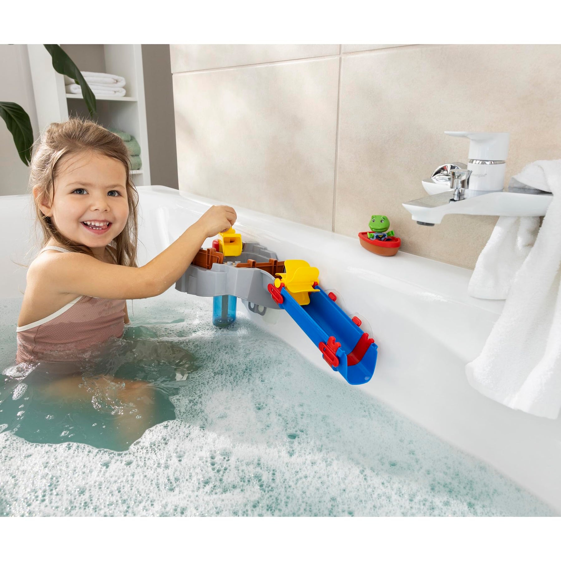 AquaPlay Sploshy Wasserspielzeug „Mountain“ für Kinder Ob beim Wasser pumpen, Schleusen öffnen oder Wasserrad ankurbeln: Die vielseitigen Spiel-Möglichkeiten mit dem Wasserspiel-Set regen die Fantasie und das Interesse der Mädchen & Jungen ab 18 Monaten am Element Wasser an. Ergänzt wird das umfangreiche Kinderspielzeug zusätzlich durch eine kleine Gießkanne und ein Boot mit der beliebten AquaPlay Figur Nils, dem Frosch. Faszinierender Wasserspaß beim Baden Das Sploshy-Spielset „Mountain“ besteht aus einem eindrucksvollen Stausee mit zwei Schleusen und einer Wasserrutsche, die mit einem Wasserrad ausgestattet ist. Mithilfe einer stabil angebrachten Pumpe befördern die Kleinkinder das Wasser aus der Wanne oder dem Becken nach oben in den Stausee. Durch das Öffnen der passenden Schleuse erzeugen die Kinder je nach Wasserstand entweder einen tosenden Wasserfall oder einen sanften Regenvorhang. Öffnen die Kids dagegen die andere Schleuse setzt sich das Wasserrad in Bewegung und füllt die Wasserrutsche mit Wasser – ein beeindruckendes Schauspiel und spritziges Bade-Vergnügen für die Kleinen! Hergestellt in Deutschland Das Badewannenspielzeug wurde in Deutschland aus UV-beständigem Material gefertigt – mit sorgfältig gestalteten Dichtungen, die die Bahn wasserdicht verschließen. Durch die mitgelieferten Saugnäpfe wird das Wasserspielset einfach und stabil an der Badewanne, an den Bad-Fliesen oder an einer Glaswand auf Balkon bzw. Terrasse angebracht und kann nach Belieben durch weitere Wasserbahnen und Zubehör-Teile von AquaPlay Sploshy erweitert werden. AquaPlay – spielstarke Wasserbahnen Mit AquaPlay kehrt der Wasserspaß in den heimischen Garten ein – und jetzt auch ins Badezimmer! Bereits seit 1977 produziert AquaPlay Wasserbahnsysteme für Kinder. Die Produkte werden regelmäßig von unabhängigen Prüfinstituten getestet.