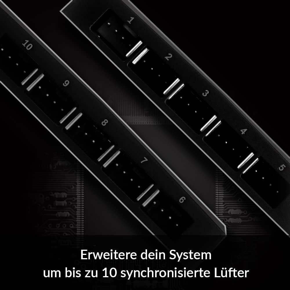 • TECHNISCHE DETAILS: Output: 10 x 4-pin PWM Sockel, Stromstärke (Output): bis zu 1 A pro Port, Input: SATA Power +4-pin Fan Header, Stromstärke (Input): bis zu 4,5 A, Dimensionen: 55,6 x 86,3 x 14,3 mm