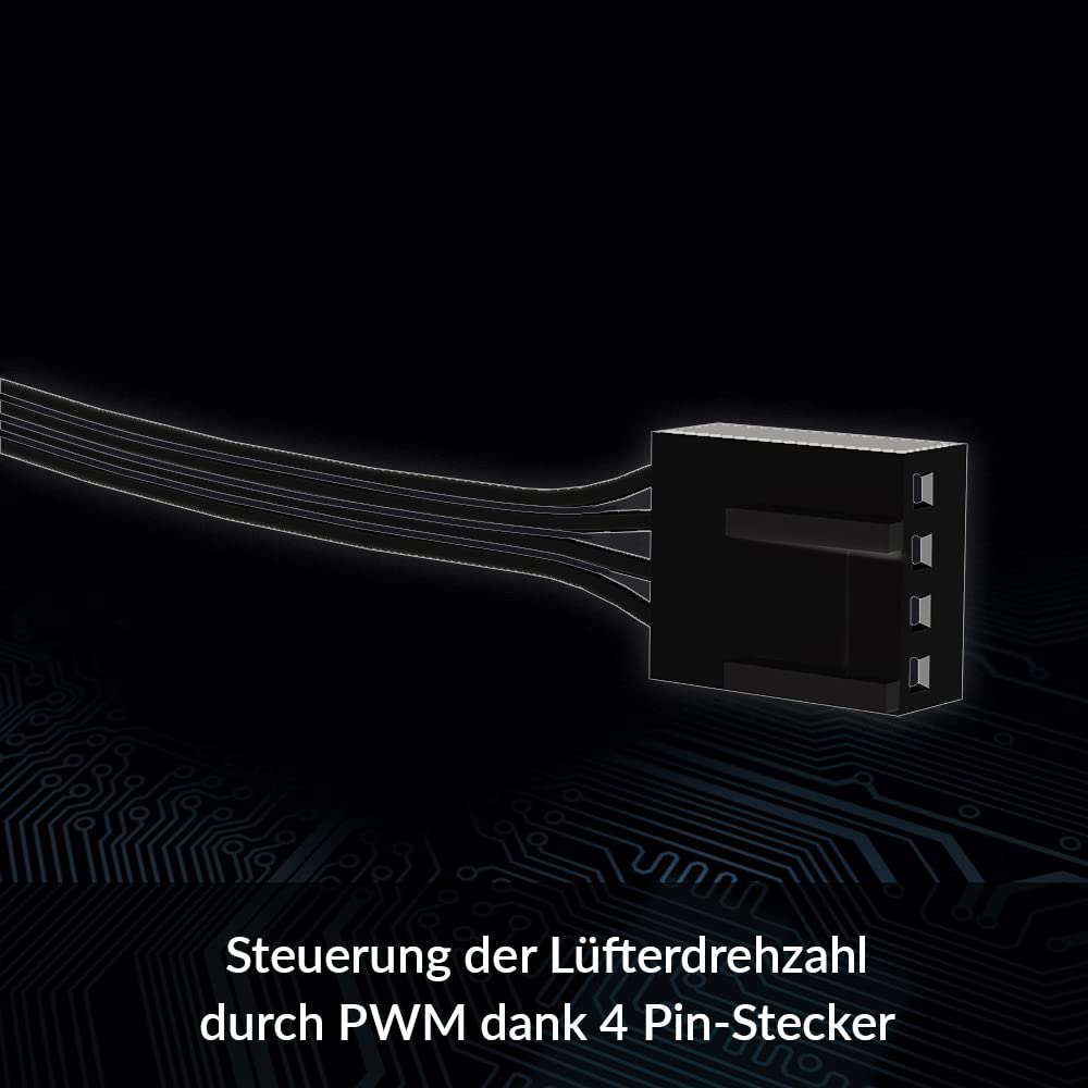 - 200 BIS 1800 RPM (0 RPM <5 %): Dank des 4-Pin Steckers kann die Lüfterdrehzahl via PWM gesteuert werden. Dies reduziert die Geräuschentwicklung auf ein Minimum und garantiert gleichzeitig höchste Kühlleistung
