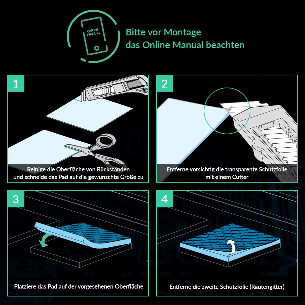 • BITTE BEACHTEN: Aufgrund der äußerst geringen Härte der Wärmeleitpads ist eine anspruchsvollere Installation zu erwarten. Bitte das User Manual beachten