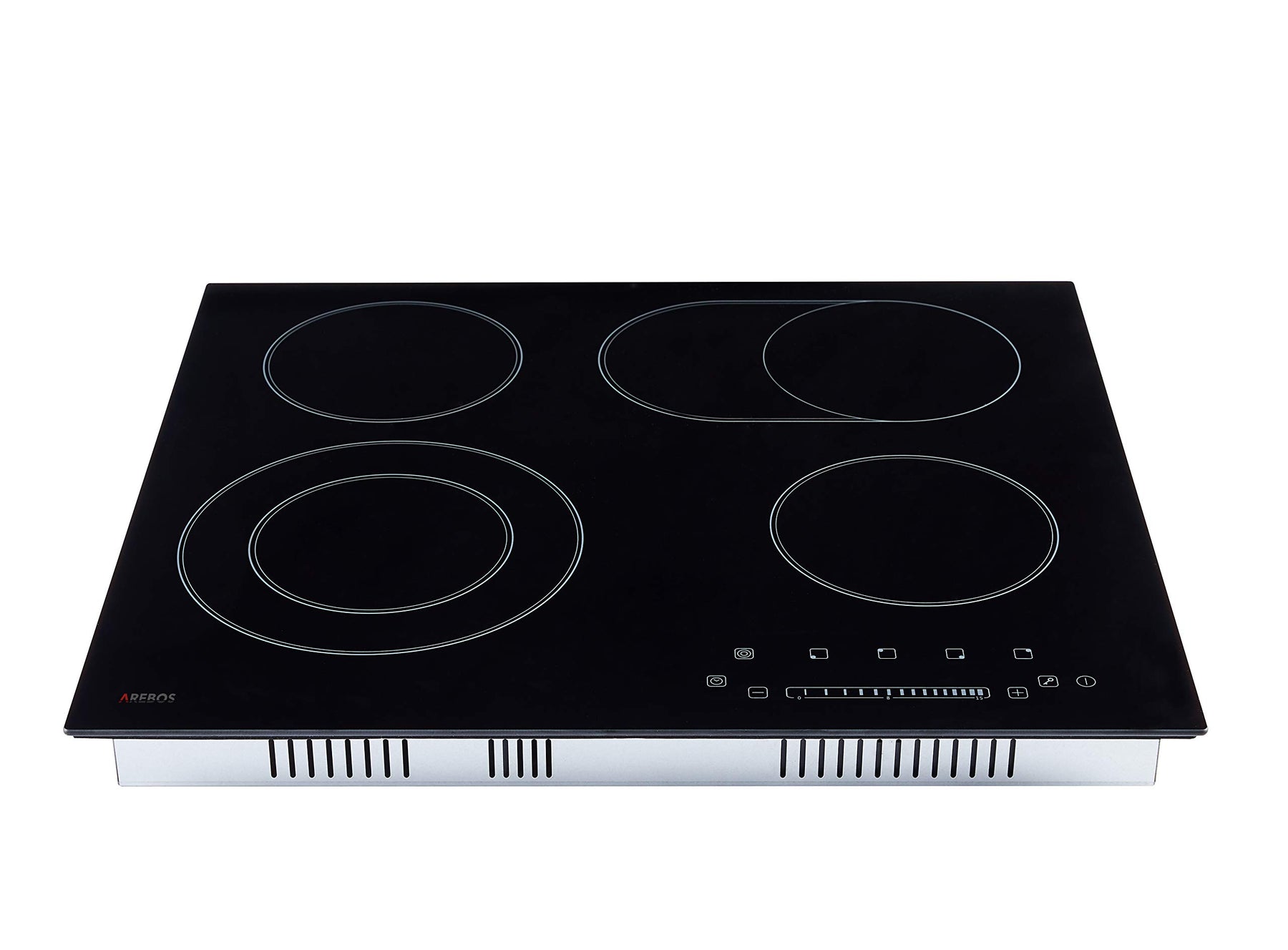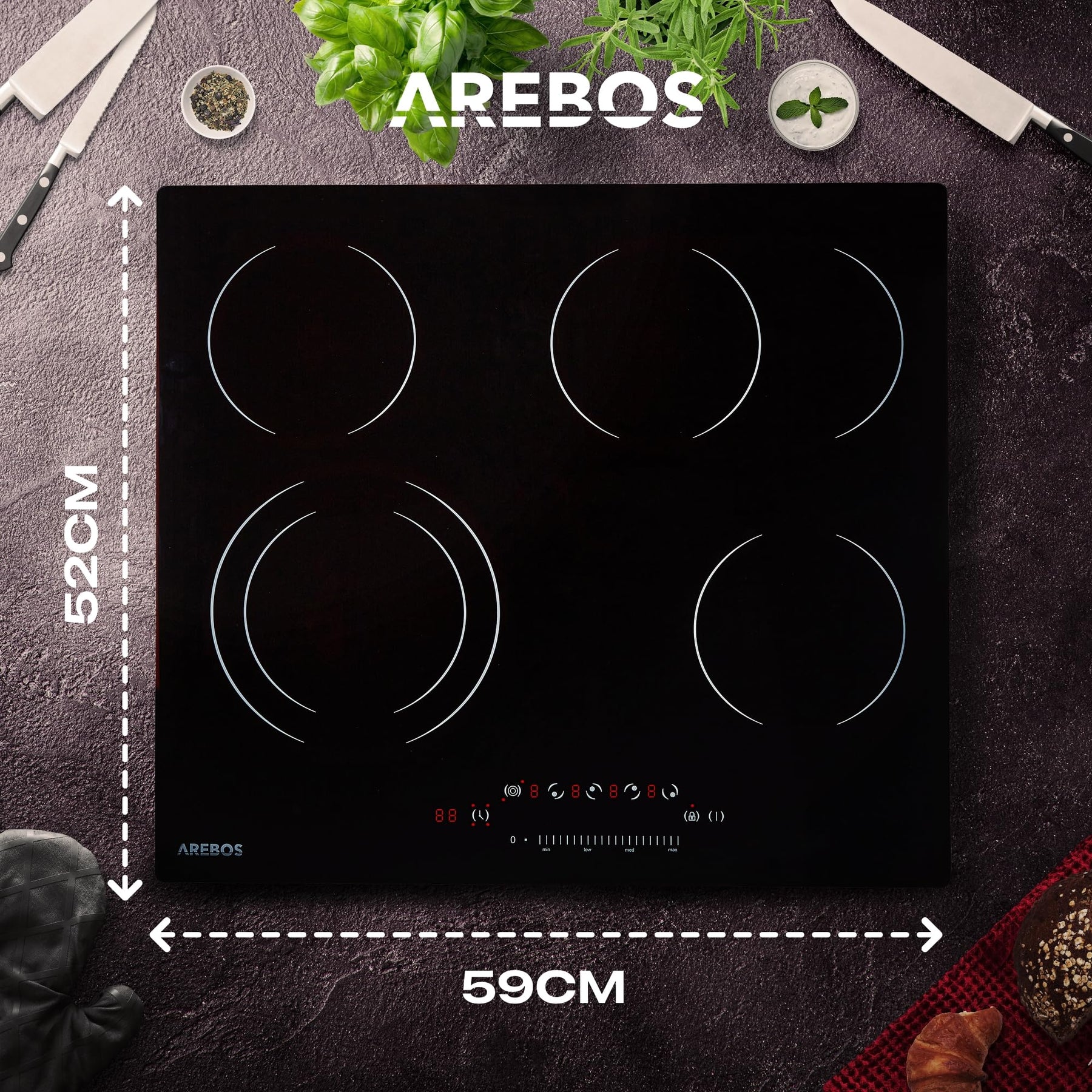- [Leichte Pflege] Die Oberfläche des AREBOS Kochfeldes besteht aus schwarzem Glaskeramik und ist äußerst einfach abzuwischen und somit sehr pflegeleicht. Sie erhalten zudem kostenlos einen Schaber für die Reinigung des Kochfeldes dazu!