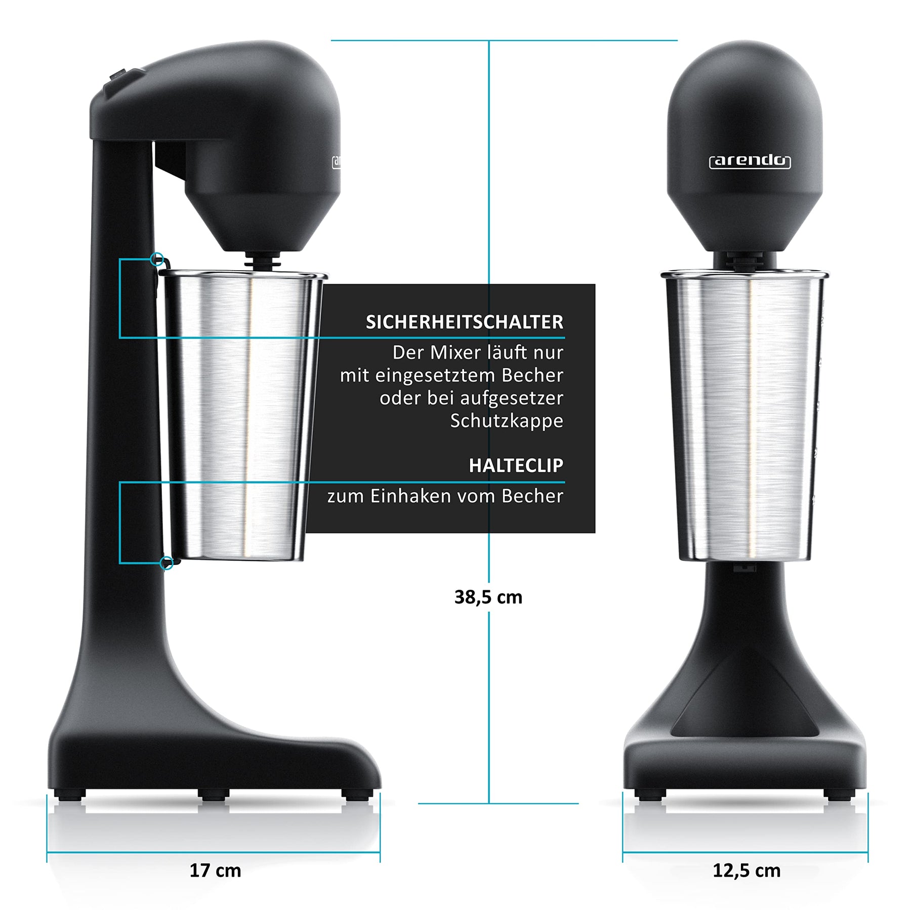 - Eleganter Mixer für aufregende Drinks. Im Gehäuse des Arendo Standmixers arbeitet ein 100 W Motor, der mit bis zu 22.000 Umdrehungen pro Minute in kürzester Zeit Sahne und Eischnee rührt. Auch Kaffeemischgetränke, Cocktails und Kakao sind im Handumdrehen zubereitet. Eine Messskala mit Füllstandsanzeige auf dem Mixbecher vereinfacht die Zusammenstellung der Zutaten. GS – Geprüfte Sicherheit. 304592