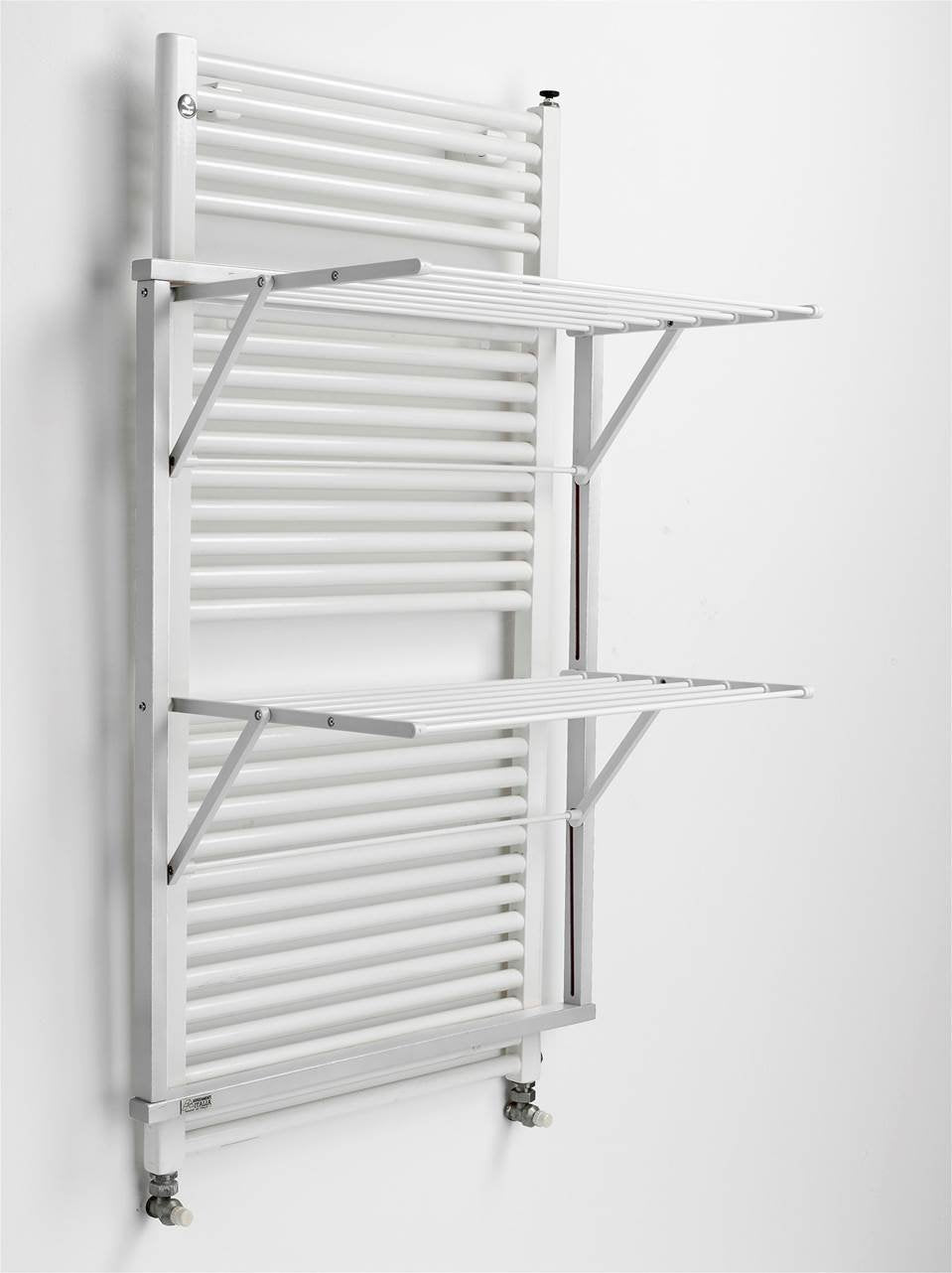 Einzelheiten: Die Wäscheständer von Arredamenti Italia, nur das Beste für die Wäsche, die so mit Leichtigkeit aufgehängt werden kann und jeden Benutzer mit Stolz erfüllt. Das Modell Klaus wurde für die Anbringung an einem Heizkörper entwickelt, so entstand das Trockengestell für beheizte Handtuchhalter. Es handelt sich um ein Produkt aus Buche Massivholz mit 2 unabhängigen Nylon-Flügeln und Stangen aus pulverbeschichtetem Aluminium. Die 2 Flügel garantieren 10 m Wäscheleine und sind leicht wieder zu verschließen. Dank seines versenkbaren Hakensystem kann es ohne Schrauben direkt an einen Heizkörper eingehängt werden. Diese Innovation bringt dieses Produkt in den Bereich der beheizten Handtuchhalter und erhöht deren Komfort und Vielseitigkeit. 2 Drehhaken, die unterhalb der oberen horizontalen Leiste angebracht werden, verschwindet unter genau dieser Leiste im geschlossenen Zustand, in offenem Zustand stehen sie senkrecht zur Leiste und können an den Rohren des Heizkörpers befestigt werden. Die Vorteile sind ganz offensichtlich, da die Wäsche dank der Heizwirkung in wesentlich kürzerer Zeit trocknen. Das Unternehmen: Arredamenti Italia group srl ist ein seit 1955 auf dem Markt etabliertes Unternehmen, das heute eine solide industrielle Realität darstellt, die fortschrittlichste Technologien mit der Liebe zum Detail und Handwerkskunst kombiniert. Die handwerkliche Tradition ermöglicht es dem Unternehmen fortschrittliche bis ins Detail ausgereifte Produkte mit viel Liebe zum Detail und mit modernen und zeitgenössischen Designs zu schaffen. Alle Materialien für die Herstellung der Produkte sind italienischer Herkunft und sorgfältigst ausgewählt, um die höchsten Qualitätsstandards zu erhalten und somit einzigartige und raffinierte Produkte anzubieten. Für die Herstellung der Produkte wird massives Buchenholz verwendet, das mit dem Zertifikat ICILA-COC-000082 ausgezeichnet ist und den internationalen Standards FSC, für den Schutz von Waldgebieten, die ihre Abholzung in Bezug auf Einhaltung der gesetzmäßigen Umweltentwicklung, mit kontinuierlicher Wiederaufforstung dieser Gebiete gewährleistet, entspricht