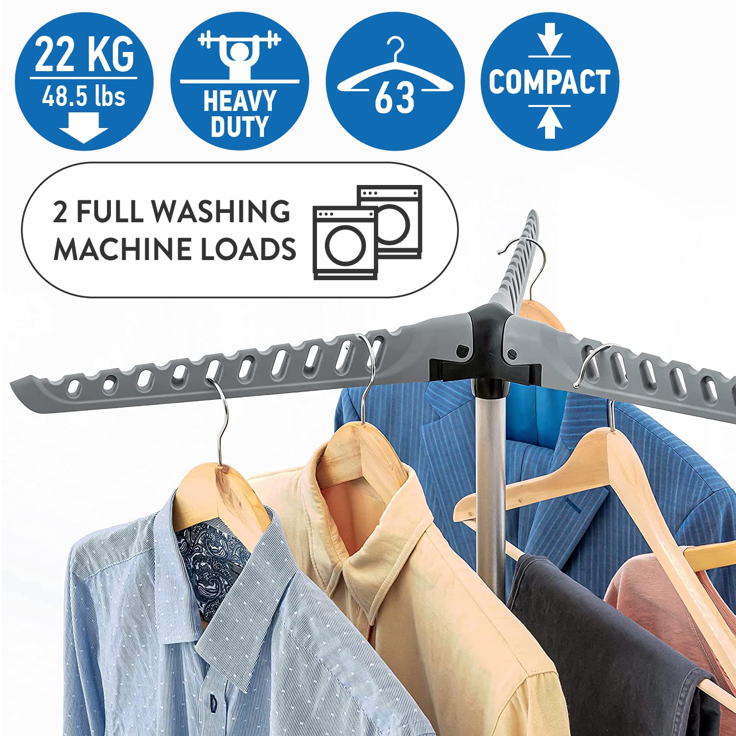 Einzelheiten: Mit Art Moon's Cedar können Sie Ihre Wäsche im Innen- und Außenbereich ohne Falten auf natürliche Weise an der Luft trocknen. Dies nimmt nur wenig Platz in Anspruch und spart Zeit beim Bügeln. Klappt schnell und einfach zusammen, wenn es nicht zur platzsparenden Aufbewahrung verwendet wird. Dies ist eine großartige Option für kleine Wohnungen und für den Transport. Unser Kleiderbügel aus rostfreiem pulverbeschichtetem Stahl und ABS-Kunststoff ist äußerst langlebig und robust. Robustes Design, das bis zu 63 Kleiderbügel aufnehmen kann und bis zu 22 kg oder 2 volle Waschladungen aufnehmen kann. Abmessungen: 66 x 57 x 130 cm. Kommt mit 2 Jahren Garantie.