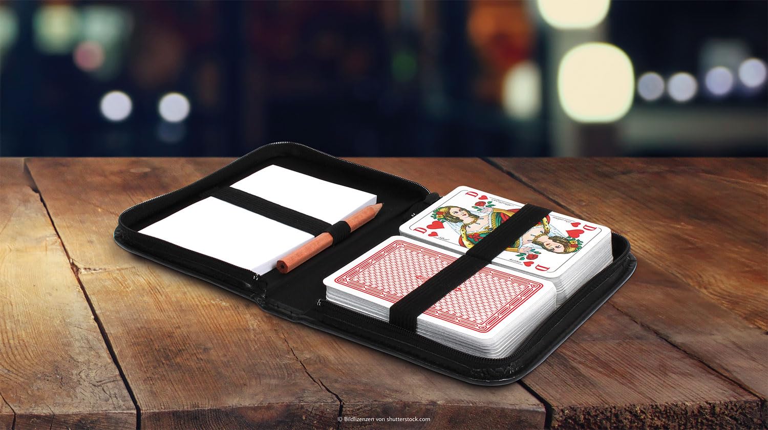 2 x 55 Spielkarten, Bleistift, Block und Spielregel im Kunstlederetui