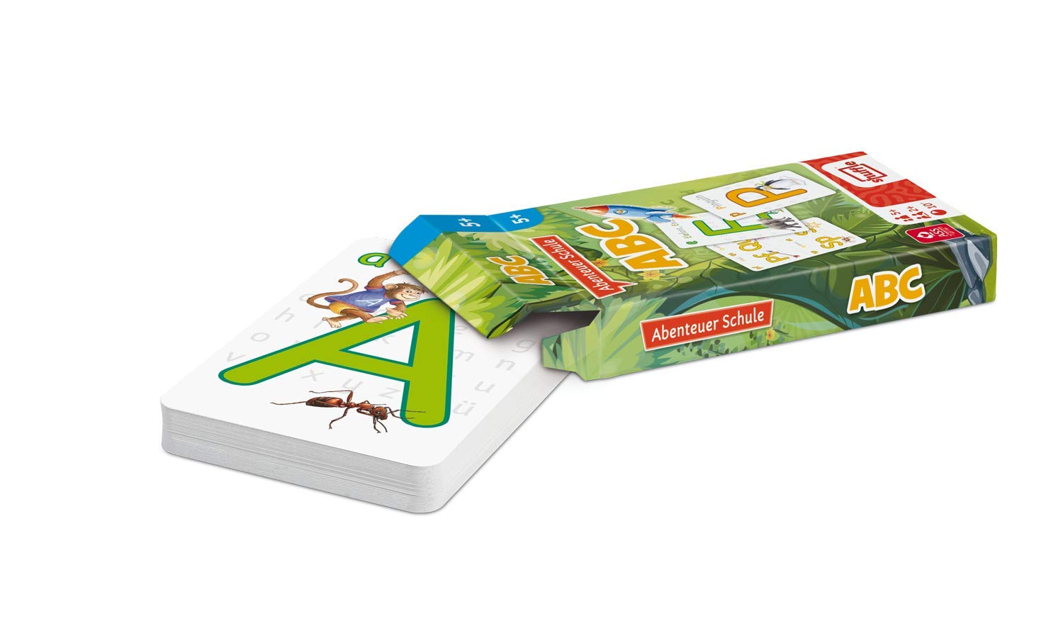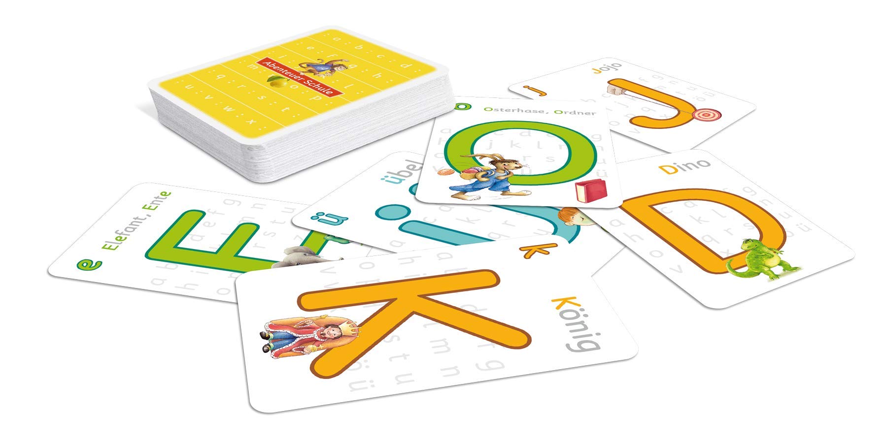 Buchstaben erkennen, lesen, schreiben und in den richtigen Wortkontext einordnen Silben und erste Wörter schreiben sowie wichtige Buchstabenkombinationen (z. B. „ei“ oder „eu“) kennenlernen. Mit Hilfe der liebevoll gestalteten Karten in dem ABC-Lernspiel aus der Reihe Abenteuer Schule lernen kleine Schulanfänger ab 6 Jahren die Buchstaben mit Hilfe von Bildern kennen und vertiefen die ersten Lernerfolge durch verschiedene Spielvarianten ganz spielerisch – je nach Kenntnisstand kann der Schwierigkeitsgrad der Spiele variiert werden.