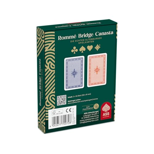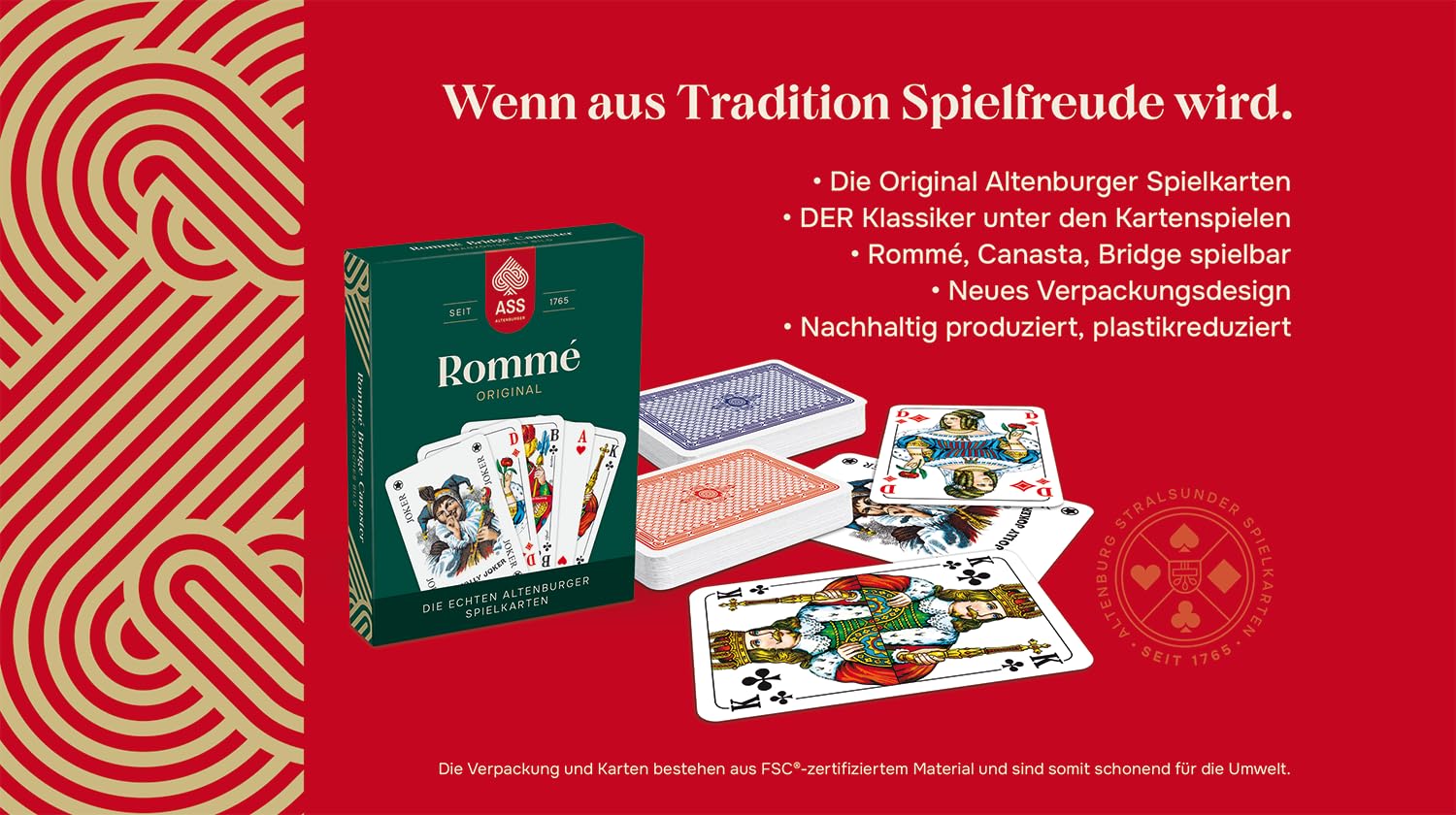 Rommé ist DER Klassiker unter den Familien-Kartenspielen! Die beliebtesten Kartenspiele der Welt von Rommé über Canasta bis Bridge sind mit diesem Spielkartenset spielbar: Die 2 x 55 Blatt inkl. 6 Joker in der praktischen Stülpdeckelschachtel bieten unzählige Möglichkeiten für einen spannenden Spieleabend. Die Karten sind, statt in Plastikfolie, mit Papier eingeschlagen, die Verpackung sowie die Karten bestehen aus FSC®-zertifiziertem Material und sind besonders schonend für die Umwelt. ASS Altenburger reduziert sukzessive den Einsatz von Plastikmaterialien auf ein notwendiges Mindestmaß, optimiert Produkte und Produktion mit dem Fokus auf Nachhaltigkeit - das ist unser Anspruch als Marke!