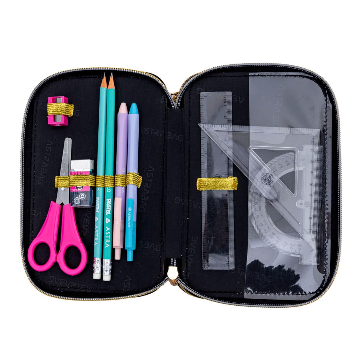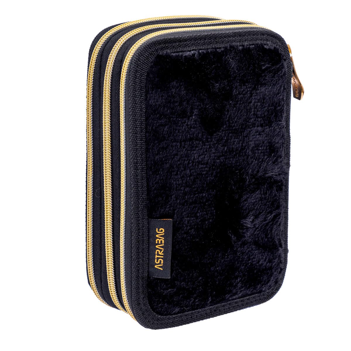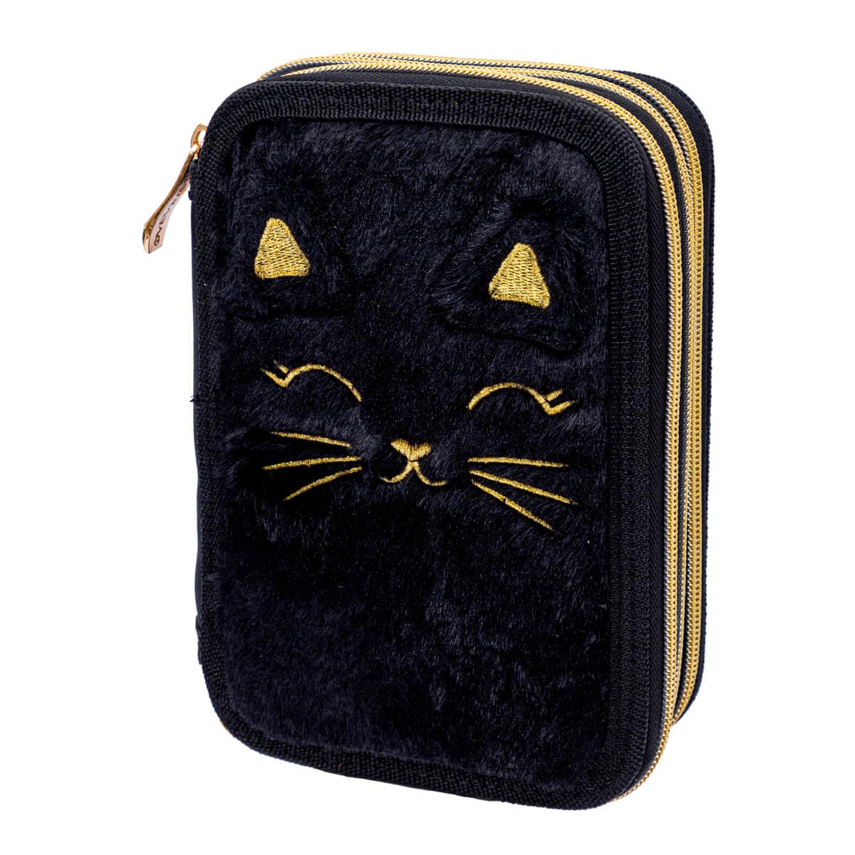 ASTRABAG 3-FACH Mäppchen Federmappe Gefüllt dreifaches Federmäppchen, Schüleretui 3-stöckig, Federtasche XXL, Federmäppchen mit Zubehör, Motiv – FLUFFY KITTY BLACK mit Plüsch und Ohren