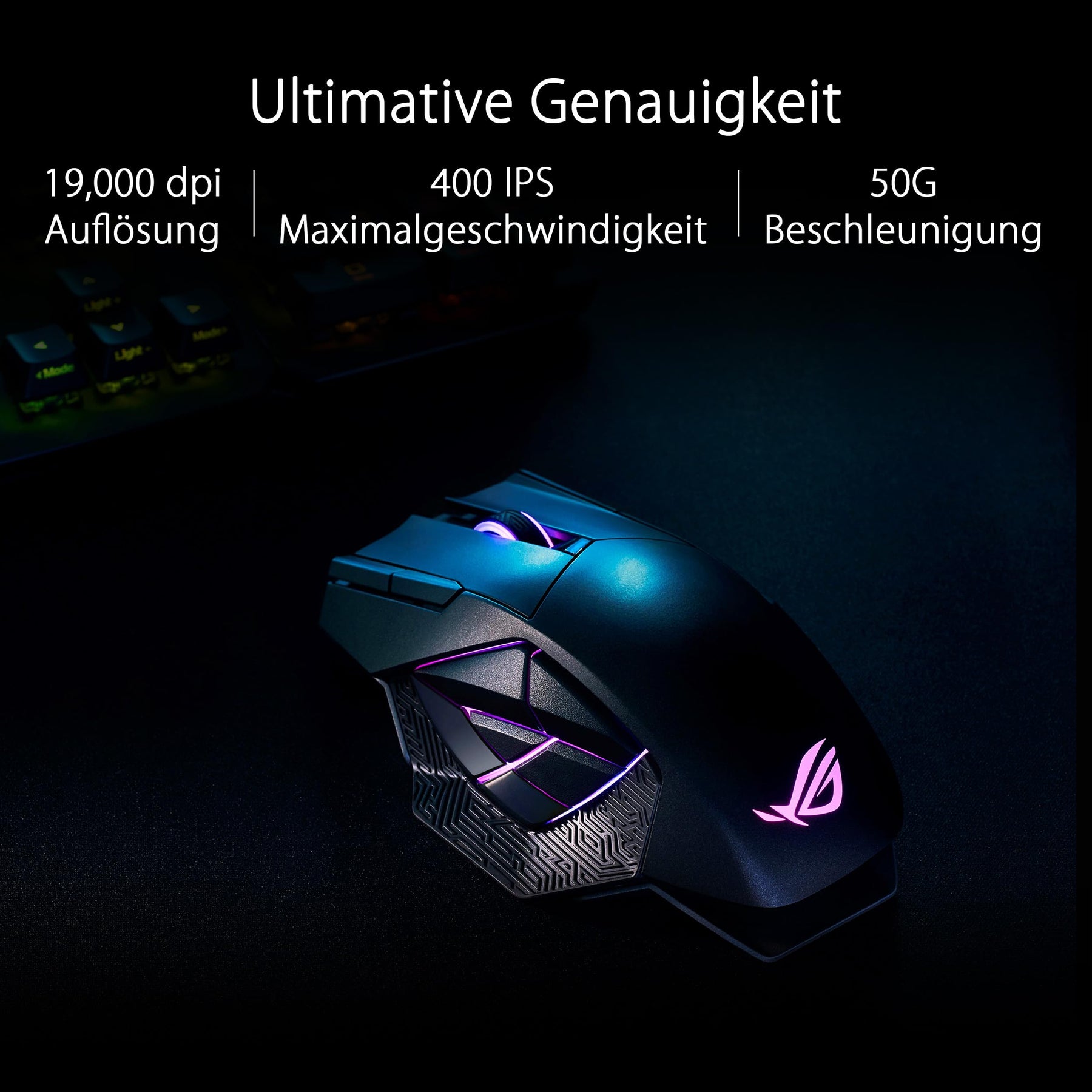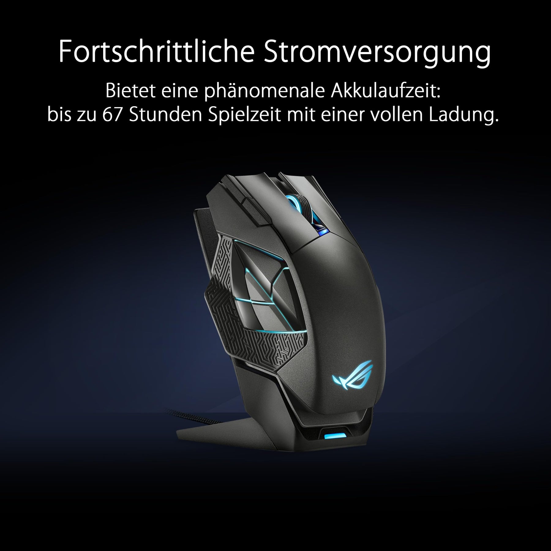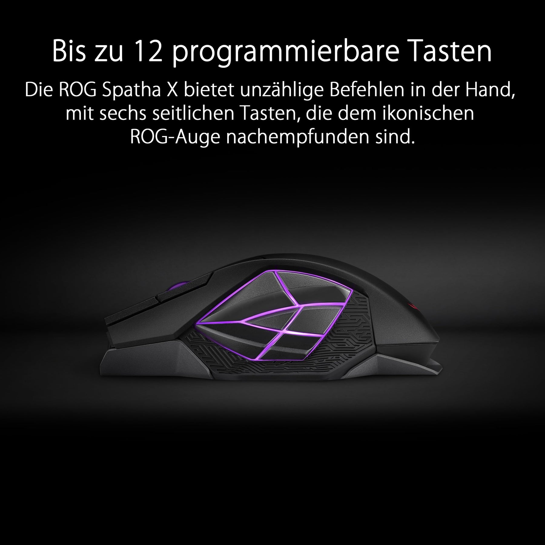 Einzelheiten: Gehen Sie in den Kampf mit ROG Spatha X. Diese kabellose Gaming-Maus verfügt über Dual-Mode-Konnektivität, sodass Sie kabellos über RF 2,4 GHz oder traditionell mit einer kabelgebundenen USB-C-Verbindung spielen können. Ein speziell abgestimmter 19.000 dpi Sensor lässt Sie Gegner schnell und mit extremer Genauigkeit abnehmen, während 12 programmierbare Tasten dafür sorgen, dass alle Befehle immer griffbereit sind. Darüber hinaus verfügt ROG Spatha X über exklusive Steckschalter-Buchsen, ROG Micro Switch, Aura Sync RGBs und eine magnetische Ladedock. Dual-Mode-Konnektivität lässt Sie Ihren Weg spielen. ROG Spatha X nutzt eine RF 2,4 GHz Verbindung mit hohem Datendurchsatz, um sicherzustellen, dass Ihre Befehle im Spiel genau verfolgt werden. Und sobald der Akku leer ist, schließen Sie ihn einfach an und fahren Sie den Kampf während des Ladevorgangs fort, ohne Reaktionsfähigkeit und Leistung zu verlieren. Ein hochgestimmter optischer Sensor mit 19.000 dpi liefert unübertroffene Genauigkeit, um Ihnen die Präzision zu geben, die erforderlich ist, um Gegner zu schlagen. Die 12 programmierbaren Tasten auf ROG Spatha X setzen eine Vielzahl von Befehlen in die Hand, mit sechs seitlichen Tasten, die dem ikonischen ROG-Auge ähneln. Die Platzierung jeder Taste wurde sorgfältig berücksichtigt, damit sie in Reichweite sind, und alle wurden entwickelt, um ein taktiles Klickgefühl für intuitive, reaktionsschnelle Steuerung zu bieten. ROG Spatha X bietet eine phänomenale Akkulaufzeit, sodass Sie bis zu 67 Stunden Spielzeit bei voller Ladung haben. Und wenn der Akku leer ist, bietet nur 15 Minuten Aufladen über USB-C oder die Ladestation bis zu 12 Stunden* intensives kabelloses Spielen. Der ROG Micro Switch verfügt über eine vergoldete Elektroverbindung und eine Lebensdauer von 70 Millionen Klicks, um die Haltbarkeit zu verbessern und die Lebensdauer der Maus zu verlängern. Strenge ROG-Fertigungsstandards sorgen dafür, dass jede Maustaste die Kraftabweichung innerhalb von +/- 5 Gramm hält und ein gleichmäßiges Klickgefühl ermöglicht.