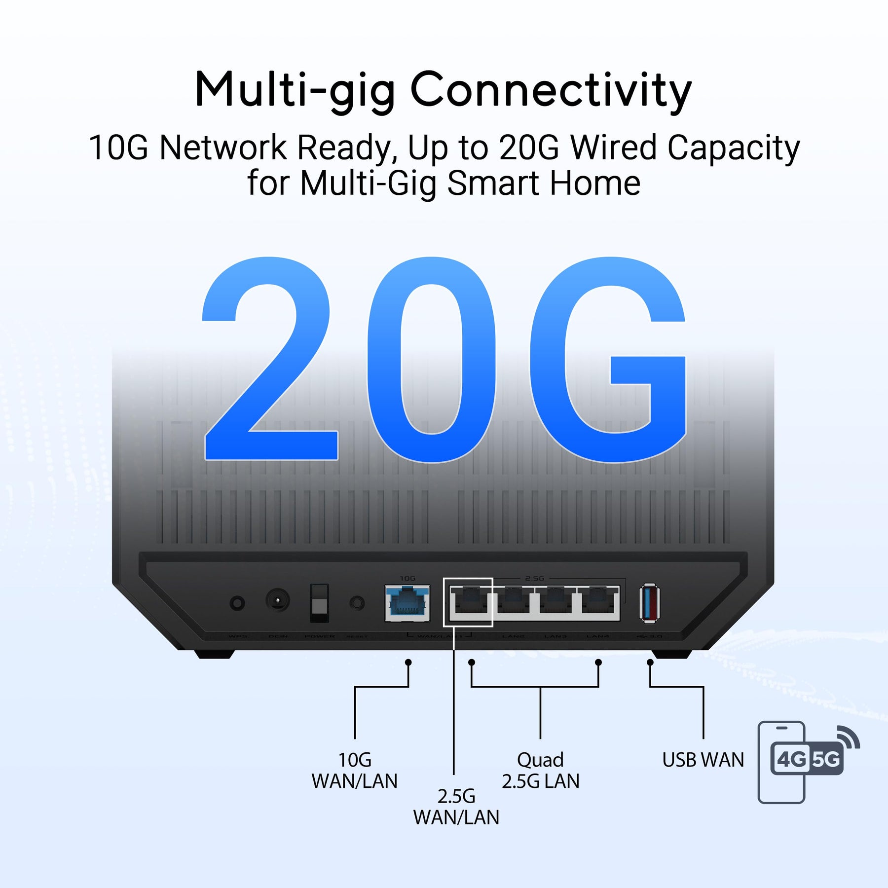 • Vielseitige WAN-Konfigurationsoptionen – Richten Sie dank AI WAN-Erkennung und einem praktischen USB-Anschluss, der für 4G LTE und 5G Mobile Tethering bereit ist, immer verfügbares Internet ein