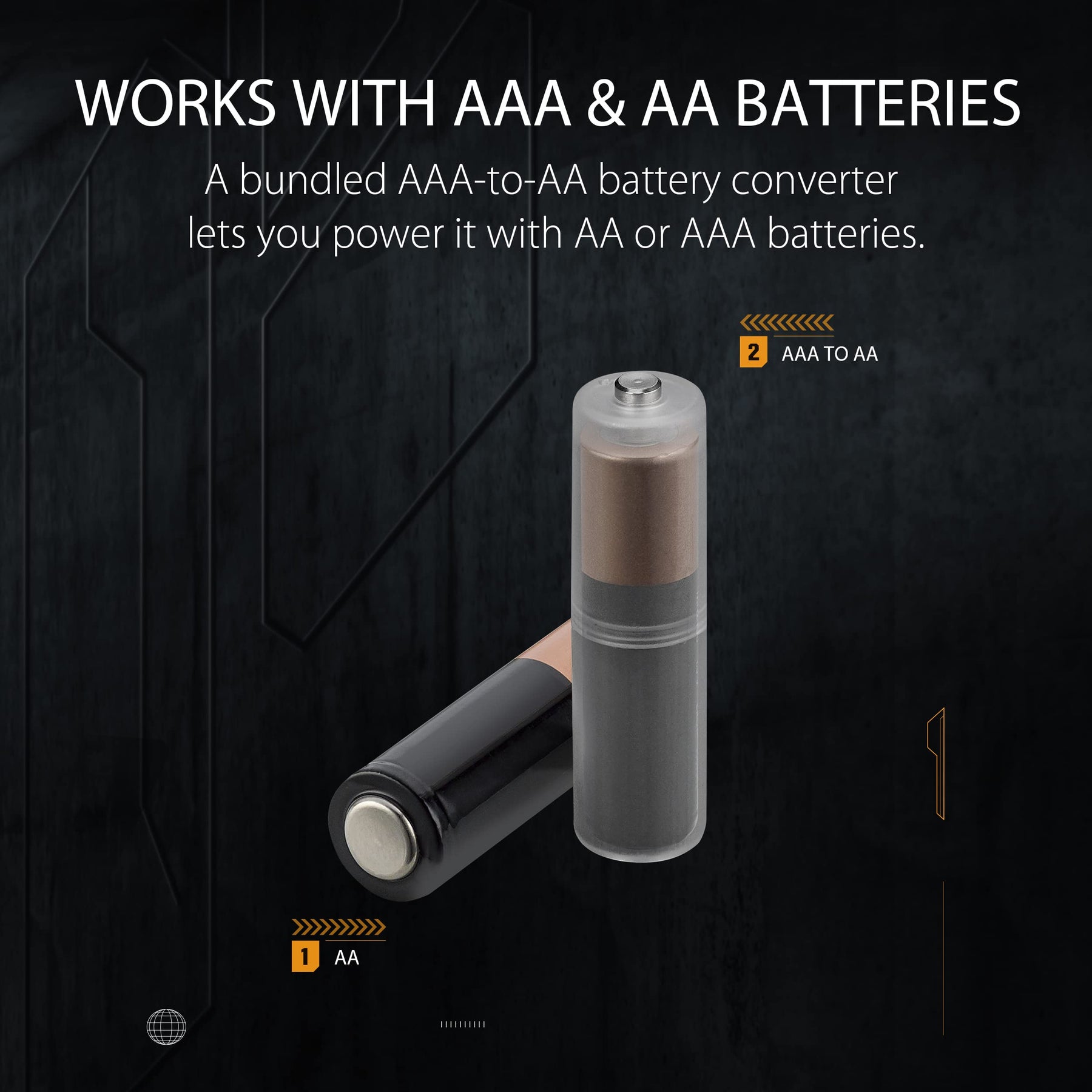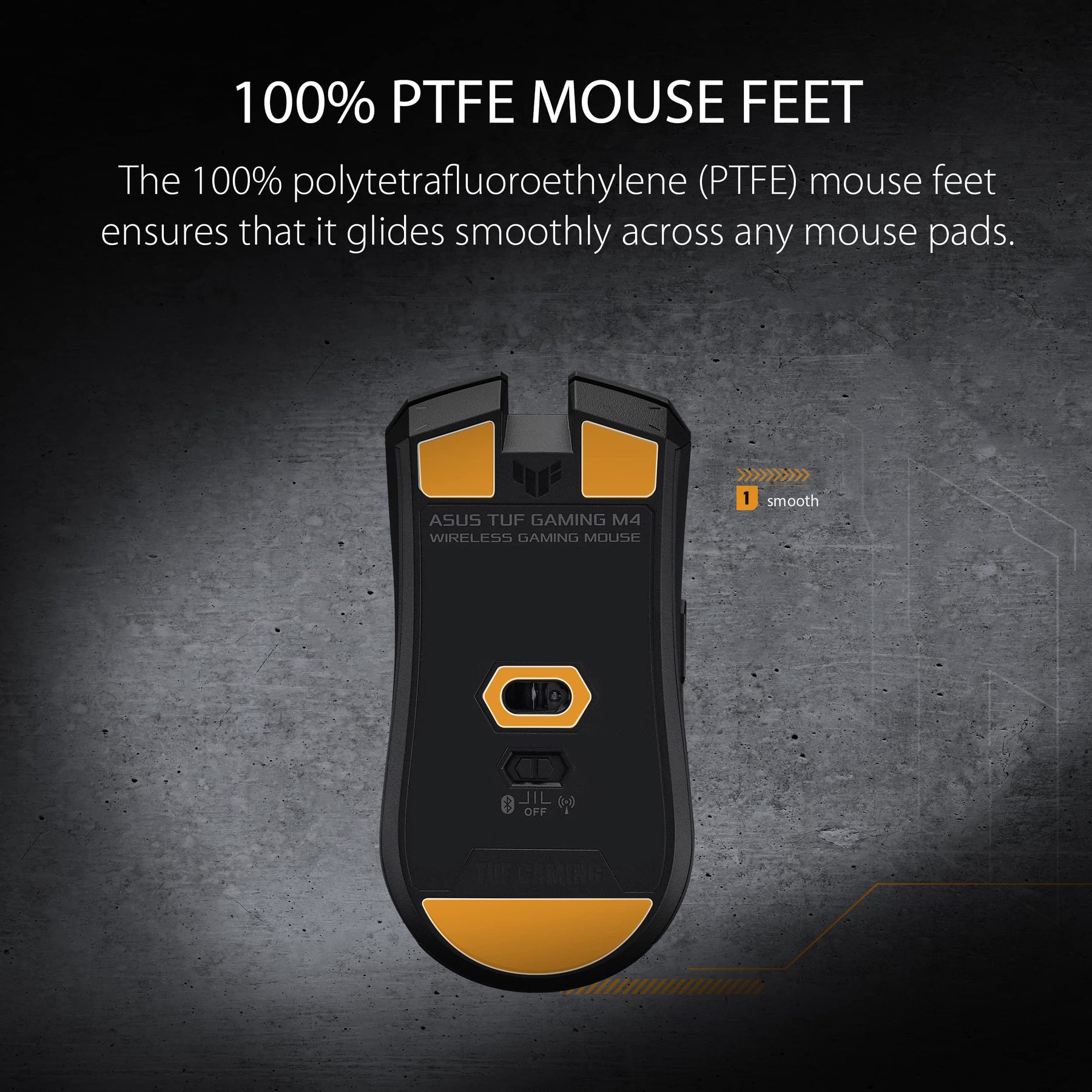 Die TUF Gaming M4 Wireless ist eine kompakte kabellose Gaming-Maus, die kompromisslose Leistung, Zuverlässigkeit und Komfort bietet. Die Mausfüße aus 100 % PTFE und der hochpräzise optische Sensor mit 12.000 dpi wurden für lange Kampagnen entwickelt und bieten eine punktgenaue Kontrolle für einen zusätzlichen Vorteil im Kampf. Die M4 Wireless wurde mit einem beidhändigem Formfaktor designt, um ein ausgewogenes Gefühl zu vermitteln, und wiegt nur 62 Gramm. Die PBT-Abdeckung ist durch die ASUS Antibacterial Guard-Beschichtung geschützt. Die M4 Wireless kann sowohl mit AAA- als auch mit AA-Batterien betrieben werden, was den Komfort erhöht.