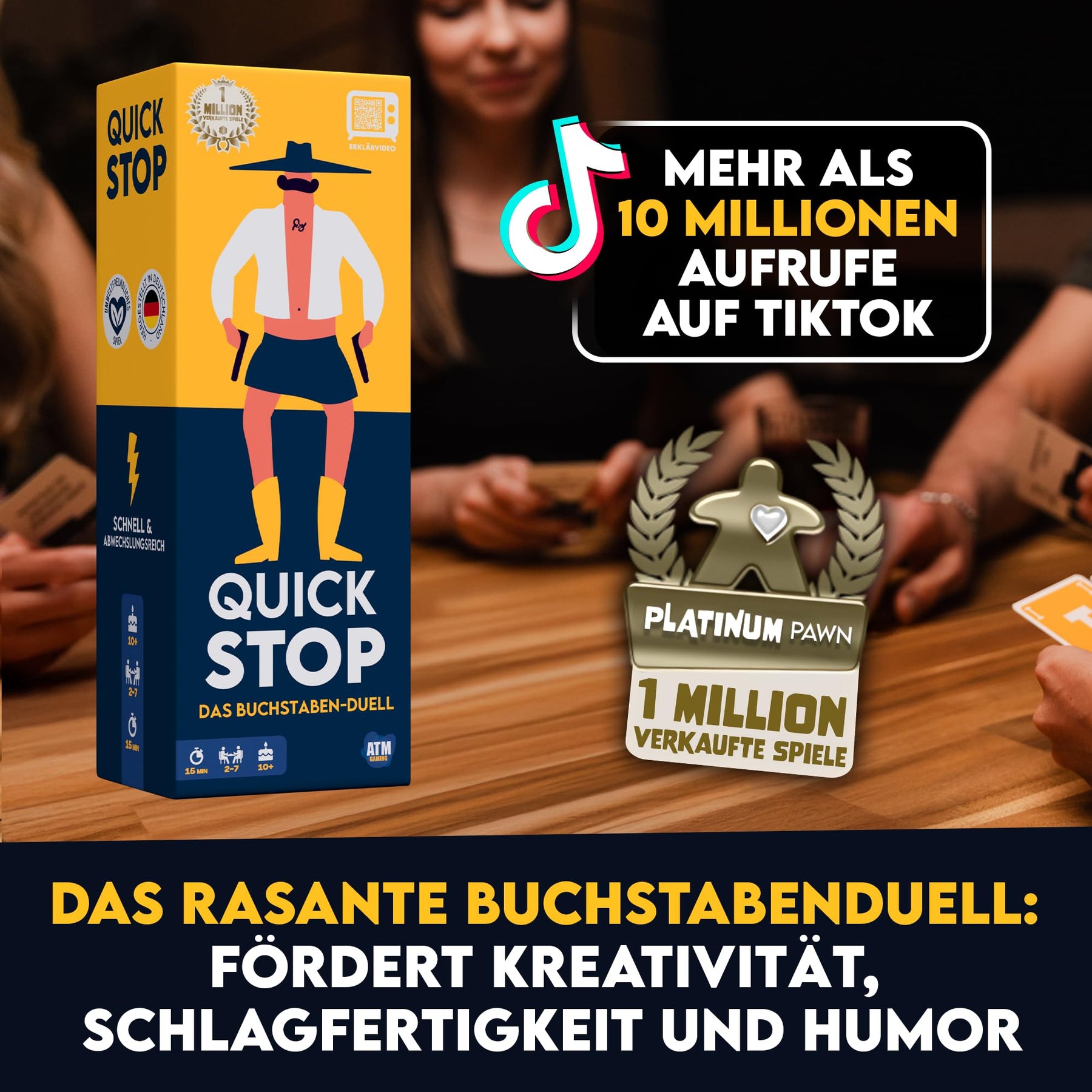 - 🥳 Entdecke das aufregende Gesellschaftsspiel "QUICKSTOP" – ein packendes Erlebnis für dich und deine Freunde! Spiele mit 2-7 Mitspielern in nur 15-30 Minuten – die Regeln sind in einer Minute erklärt, und der Spielspaß kann beginnen