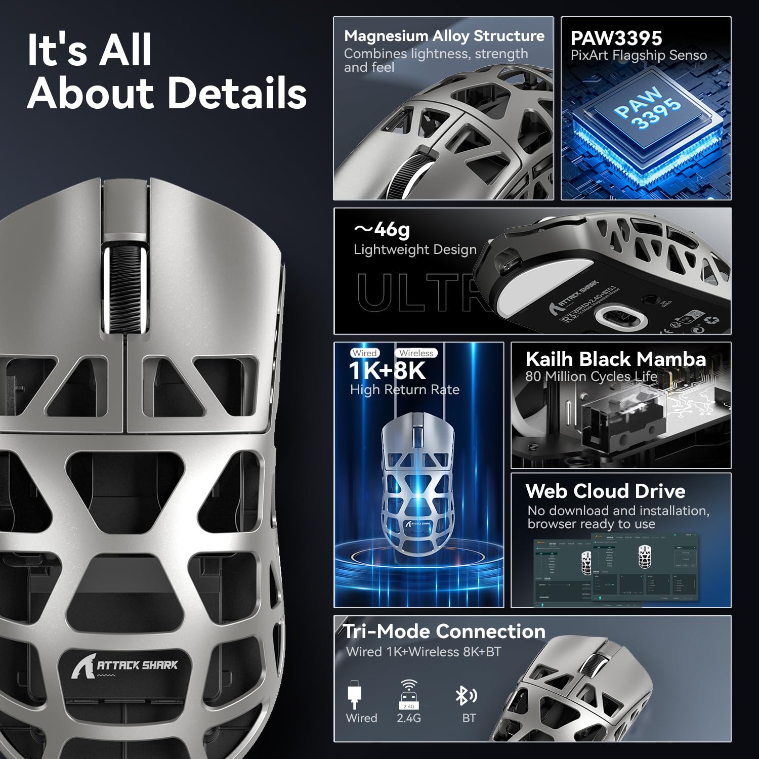 ATTACK SHARK R3 Magnesiumlegierungsmaus, kabellose 8K-Maus, 46 g SUPERLIGHT-Maus, PixArt PAW3395-Gaming-Sensor, BT/2,4 G/kabelgebundene Gaming-Maus, einstellbare DPI 26000, Büromäuse für Win11/Xbox/PS