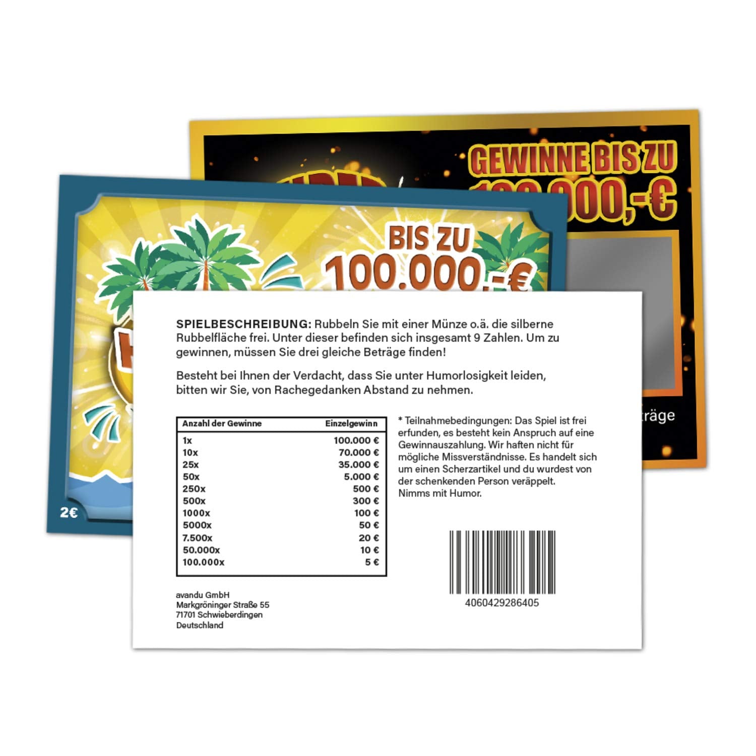 Einzelheiten: Wer drei mal den gleichen Betrag unter der Rubbelfläche sieht steht möglicherweise kurz vor einem Herzinfarkt. Man kann ihn aber schnell wieder auf den Boden der Tatsachen zurückholen wenn er sich die Rückseite der Lose mal genau durchliest.