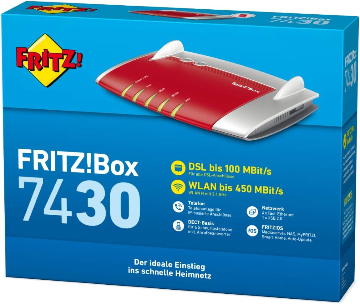 Die 7430 bietet Ihnen einen schnellen Start in die komfortable Heimverbetzung an Ihrem IP-Anschluss. Dank der WLAN-N-Technologie erreichen Sie höhere Geschwindigkeiten, zusätzlich wird die Reichweite Ihrer Verbindung erhöht. * VDSL-/DSL-Router * WLAN 802.11n/b/g * Fast-Ethernet, USB 2.0, DSL/VDSL * Integrierter Anrufbeantworter, Fax-Funktion Internet und Telefonie Schließen Sie Ihr Telefon an der FRITZ! Box 7430 an und bleiben Sie dank des integrierten Anrufbeantworters stets über Ihre Anrufe informiert. Die Faxfunktion sorgt für das gewisse Extra in Ihrem Zuhause. Die FRITZ! Box 7430 als Multimedia-Zentrale Die leistungsstarken USB-3-Anschlüsse machen die 7430 zur idealen Multimedia-Zentrale. Musik, Bilder und Filme sind überall sofort verfügbar, ohne lange Wartezeiten.