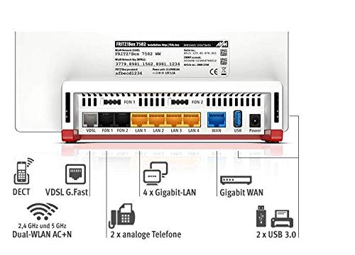 Einzelheiten: Highspeed-DSL an allen Anschlüssen Die FRITZ!Box 7582 bringt das High-Speed-Heimnetz an jeden DSL-Anschluss – egal, ob ADSL, ADSL2+ oder VDSL – und wird mit einer Fülle an Extras höchsten Ansprüchen gerecht. Die FRITZ!Box 7582 unterstützt mit VDSL-Vectoring den aktuellen Standard für Übertragungsleistungen von über 100 MBit/s. Der Datendurchsatz innerhalb benachbarter Kupferleitungen wird damit spürbar verbessert. Die FRITZ!Box 7582 kann an den DSL-Anschlüssen sämtlicher Anbieter eingesetzt werden. Produkthighlights Geeignet für alle IP-basierten Anschlüsse (ADSL und VDSL) Höchste Internet-Geschwindigkeit durch VDSL-Vectoring Ultraschnelle 1.333 MBit/s und stabilste Übertragung durch WLAN AC (5 GHz) Schnelle 800 MBit/s und höchste Reichweite durch WLAN N (2,4 GHz) Intelligentes WLAN mit 4x4 Multi-User MIMO für flexible Einbindung von vielen mobilen Geräten gleichzeitig, unterstützt WLAN-Mesh VoIP-Telefonanlage mit vielseitigen Komfortfunktionen für alle Telefone (Analog-, ISDN-, DECT- und IP-Telefone) Bis zu 6 Schnurlostelefone über integrierte DECT-Basis einsetzbar Analog-Telefone, -Fax, -Anrufbeantworter, -Türsprechanlage anschließbar 2 leistungsstarke USB 3.0-Anschlüsse für Speichermedien (NAS), Netzwerkdrucker und Mobilfunksticks 4 ultraschnelle Gigabit-LAN Anschlüsse für Computer, Fernseher und andere Netzwerk-Geräte 1 Gigabit-WAN-Anschluss für die Anbindung an Kabel- oder Glasfasermodems 2 analoge Anschlüsse High-End-WLAN AC+N mit 1.300 + 450 MBit/s Die FRITZ!Box 7582 trägt mit ihrer innovativen WLAN-Ausstattung der ständig steigenden Anzahl von WLAN-Geräten im Haushalt Rechnung. Durch das erweiterte Mehrantennen-Verfahren (4x4 Multi-User-MIMO) wird eine optimale Verbindung zu mehreren, gleichzeitig verwendeten WLAN-Geräten ermöglicht. Zugleich funkt die FRITZ!Box dank Dual-WLAN parallel in den Frequenzbändern 2,4 GHz (WLAN N) und 5 GHz (WLAN AC), wodurch faktisch zwei WLAN-Netze bereitgestellt und in Summe Datenraten von bis zu 2.133 MBit/s erzielt werden können. Mehrere, sehr breitbandintensive Anwendungen werden so im Parallelbetrieb nutzbar. Diese weiterentwickelten WLAN-Übertragungsverfahren vergrößern nochmals den Funkradius – bei stabil hohen Datenraten und über große Entfernungen im Heimnetz. Telefonie-Optionen für jeden Anspruch Die integrierte TK-Anlage ist für die neuen IP-basierten Anschlüsse (Voice over IP) ausgelegt. Telefongespräche werden über bis zu sechs Schnurlostelefone, die sich an der integrierten DECT-Basis anmelden lassen, geführt. Per WLAN werden auch IP-Telefone und Smartphones zum vollwertigen Telefon. Mehrere integrierte Anrufbeantworter, lokale und Online-Telefonbücher sowie zahlreiche Komfortfunktionen vervollständigen das breite Telefonieangebot der FRITZ!Box 7582. Über die DECT-Basisstation können auch Smarthome-Geräte sowie die schaltbare Steckdose FRITZ!DECT 200 gesteuert werden. Vielseitige Multimedia-Funktionen Die FRITZ!Box 7582 bringt sämtliche angeschlossenen USB-Speicher sowie Online-Speicher und darauf abgelegte Inhalte ins Heimnetz. Dank integriertem Mediaserver mit NAS-Anbindung werden gespeicherte Filme, Musik und Bilder verfügbar gemacht und können z.B. mittels Tablet oder Smartphone an Wiedergabegeräte verteilt werden. USB 3.0 sorgt dabei für extra schnellen Datentransfer. Die FRITZ!Box 7582 bildet damit eine leistungsfähige Plattform für vernetzte Multimedia-Anwendungen wie IPTV, Video on Demand oder Streaming. Dabei bleibt die FRITZ!Box 7582, dank mehrerer Eco-Mode-Automatismen, stets sehr sparsam im Verbrauch.
