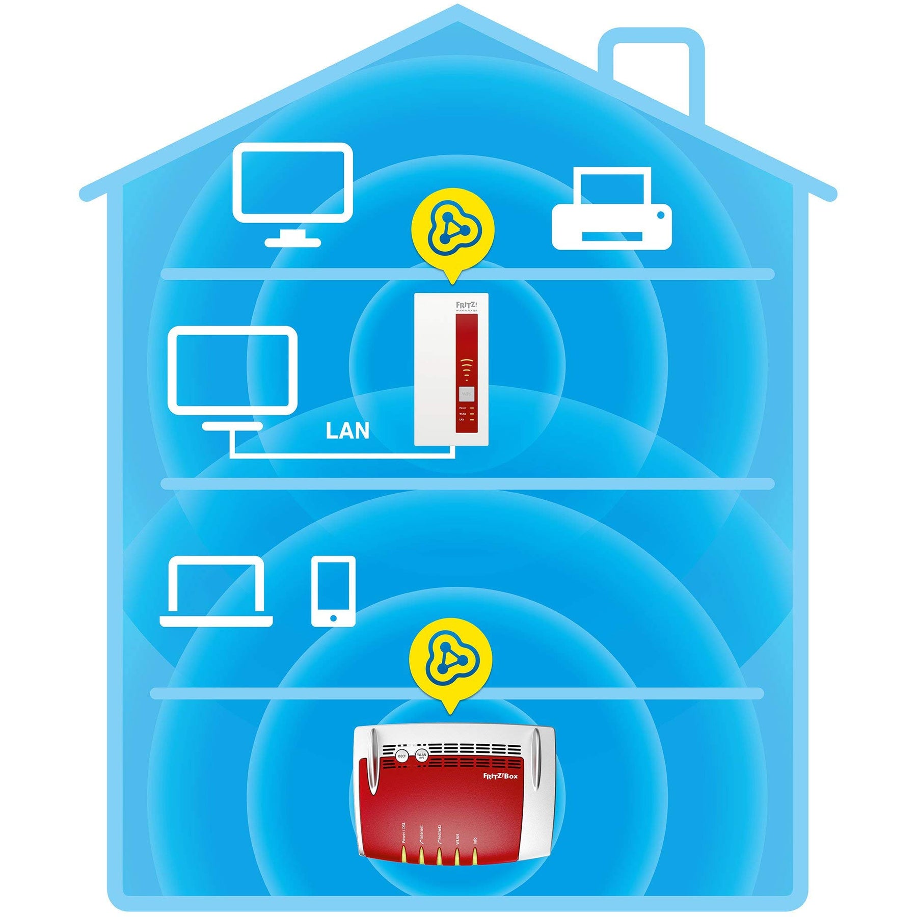 - WLAN Mesh: automatische Zusammenlegung der eingesetzten FRITZ!-Produkte zu einem intelligenten WLAN-Netz mit optimaler Leistung, kompatibel zu allen gängigen WLAN-Routern