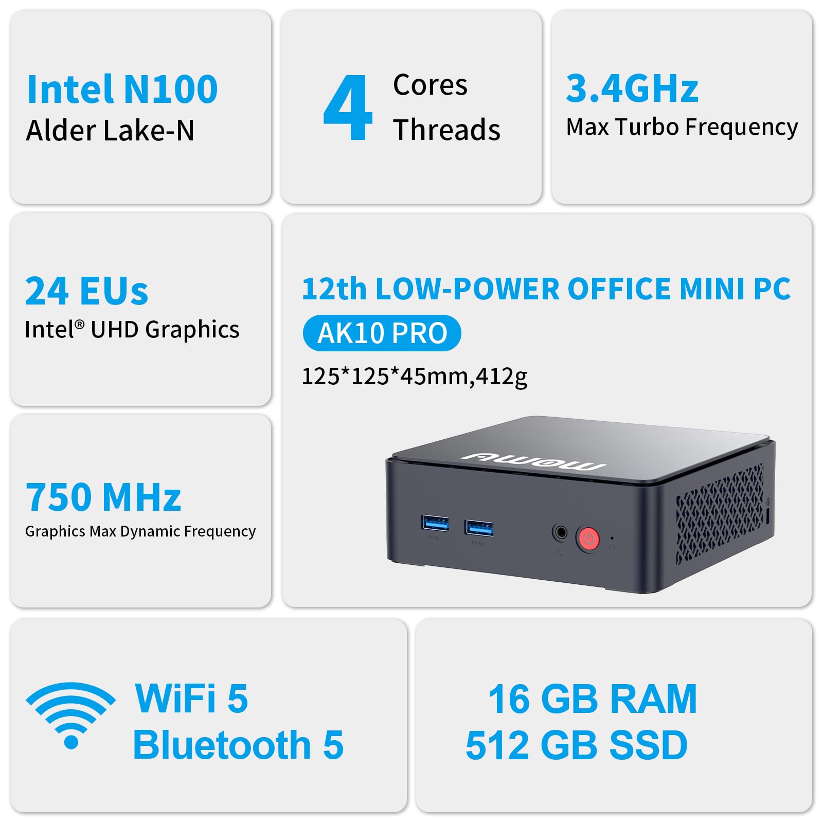 AWOW AK10 Pro Mini PC Intel 12. Gen Alder Lake N100(bis zu 3,4 GHz), 16GB RAM 512GB M.2 SSD Micro Desktop Computer W11 Pro, 4K UHD/WiFi/BT/Gigabit Ethernet Mini-pc für Zuhause/Büro/Schule
