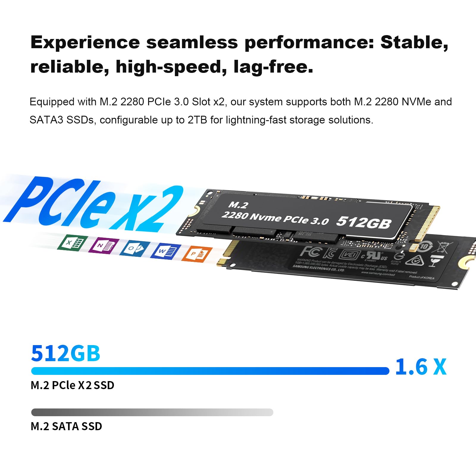 • 16GB RAM + 512GB SSD: Der AWOW N100 Mini-PC ist mit 16GB DDR4 RAM und einer 512GB PCIe x2 SSD ausgestattet. Die SSD kann auf bis zu 2TB. Darüber hinaus kann es bis zu 2TB von 2,5-Zoll 7mm SATA HDD/SSD (nicht im Lieferumfang enthalten) addieren, um den Speicher zu erweitern. Mit dieser großen Speicherkapazität können wechseln Sie frei zwischen mehreren Aufgaben und Ihre wichtigen Dateien und Filme speichern