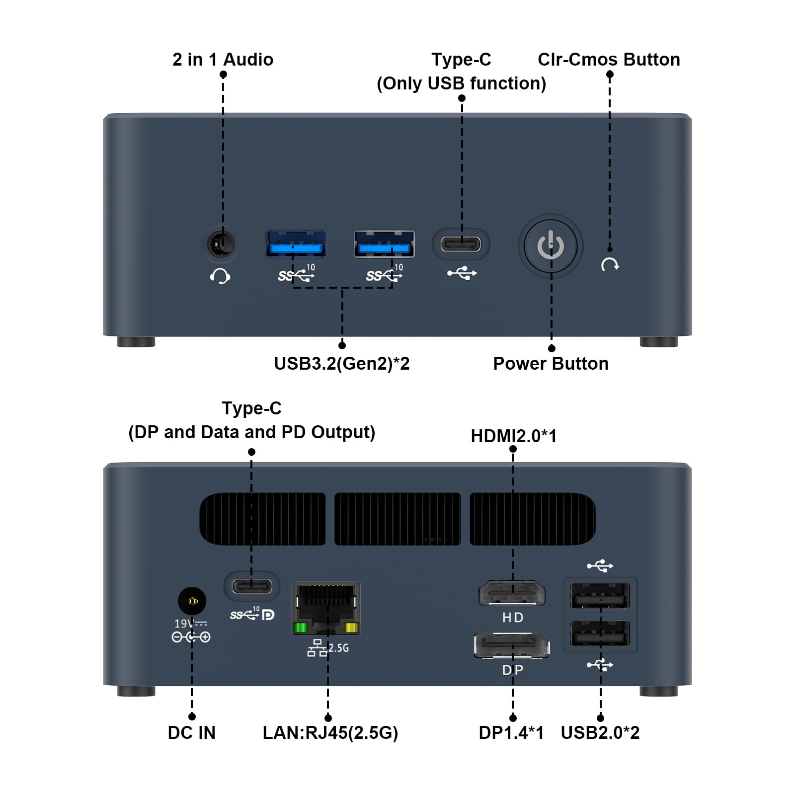- 【Umfassende Schnittstellen】Der AWOW HI12 Mini Computer ist mit zahlreichen Schnittstellen ausgestattet, darunter 1 x 2,5-Gigabit-RJ45-Ethernet-Anschlüsse, 2×USB3.2. Darüber hinaus verfügt es über einen voll funktionsfähigen Typ-C (Alt DP und Daten- und PD-Ausgang), 1 xTyp-C(Daten), 2× USB2.0, 1 × HDMI2.0, 1 × DP1.4, eine 3,5-mm-Kombibuchse und Clear CMOS. Je mehr Schnittstellen vorhanden sind, desto mehr Funktionen können ausgeführt werden
