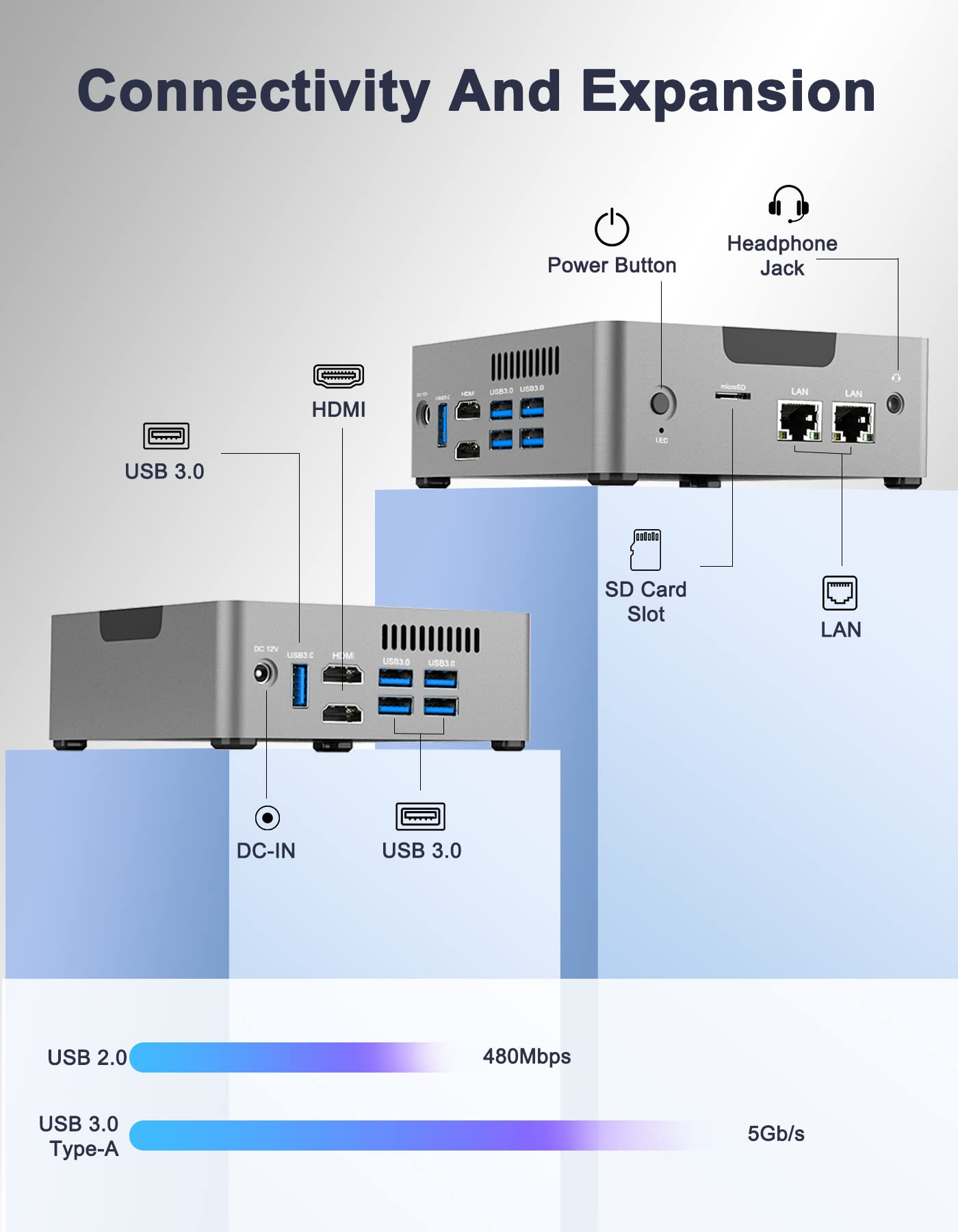• 【Baue deinen eigenen NUC】Maximiere deine Speicheroptionen mit dem AWOW Mini Desktop PC. Dieser Mini-Computer startet in Sekundenschnelle, ermöglicht blitzschnelle Dateiübertragungen und bietet eine bemerkenswerte Geschwindigkeit und Effizienz mit 6 GB Arbeitsspeicher. Zudem unterstützt er die Erweiterung des Speicherplatzes auf bis zu 2 TB, um all deine Daten sicher und bequem zu speichern.