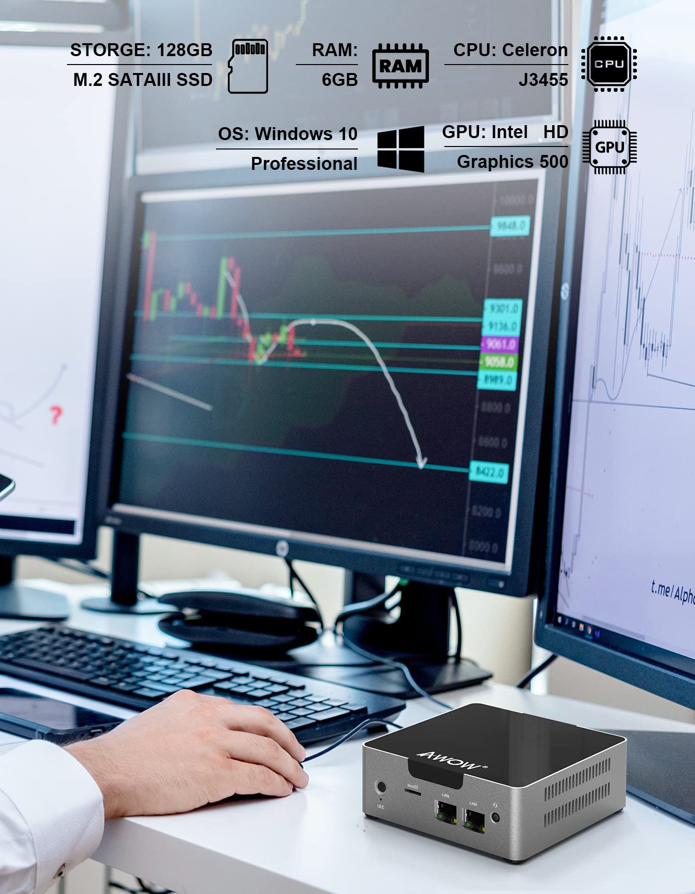 AWOW Mini PC Windows 10 Pro 6GB DDR4 128GB SSD Micro Computer,Celeron J3455 4K HD/2.4G+5G WiFi/Dual LAN/BT 4.2/HDMI*2 AK34