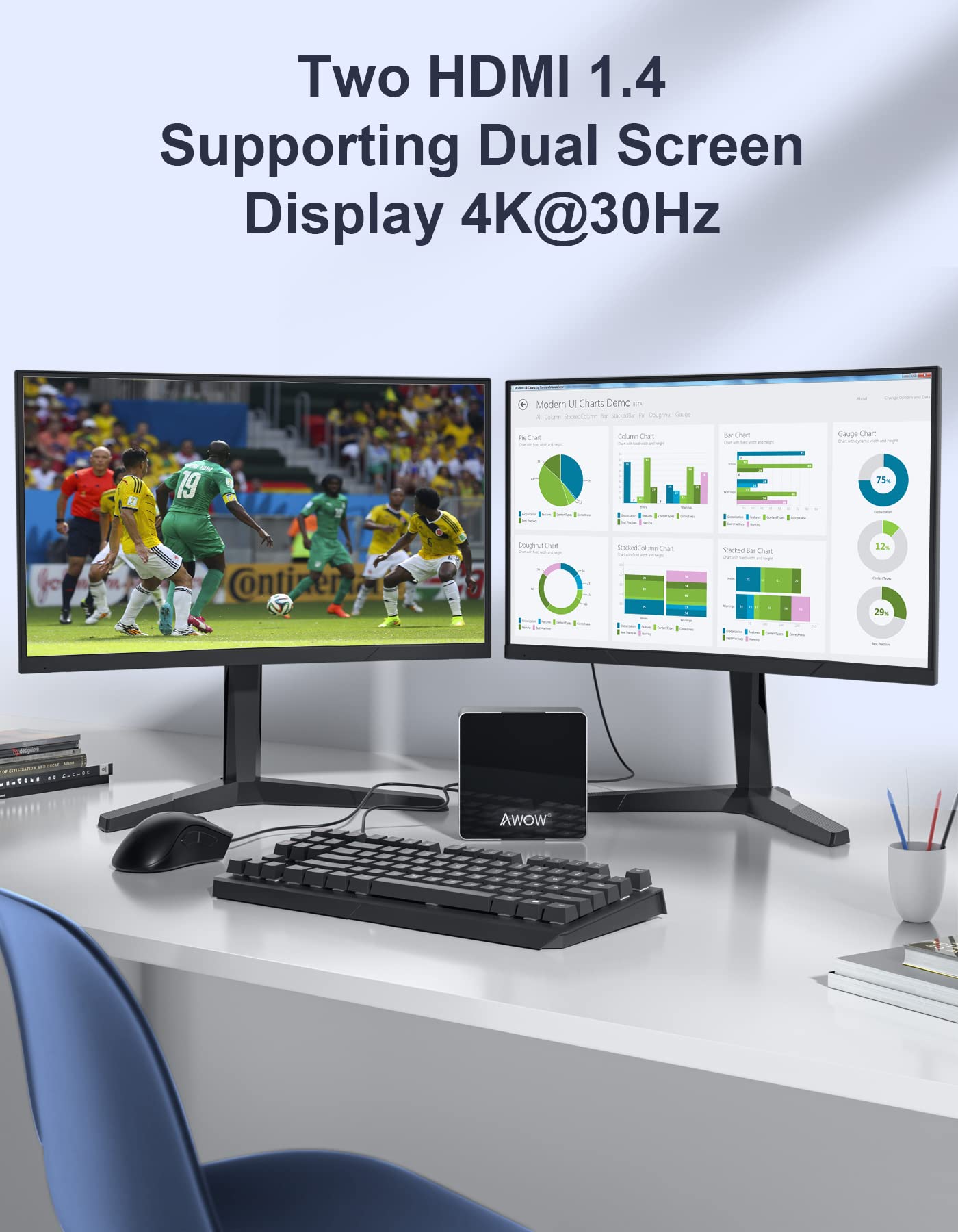 • 【Echte 4K@60Hz Dual Screen Display】AWOW Mini Desktop Computer mit UHD Graphics mit 24 Execution Units und einer maximalen dynamischen Grafikfrequenz von 750 MHz. Unterstützt Dual Screen Display (HDMI*2 4K@60Hz), was Zeit spart und die Arbeitseffizienz verbessert.