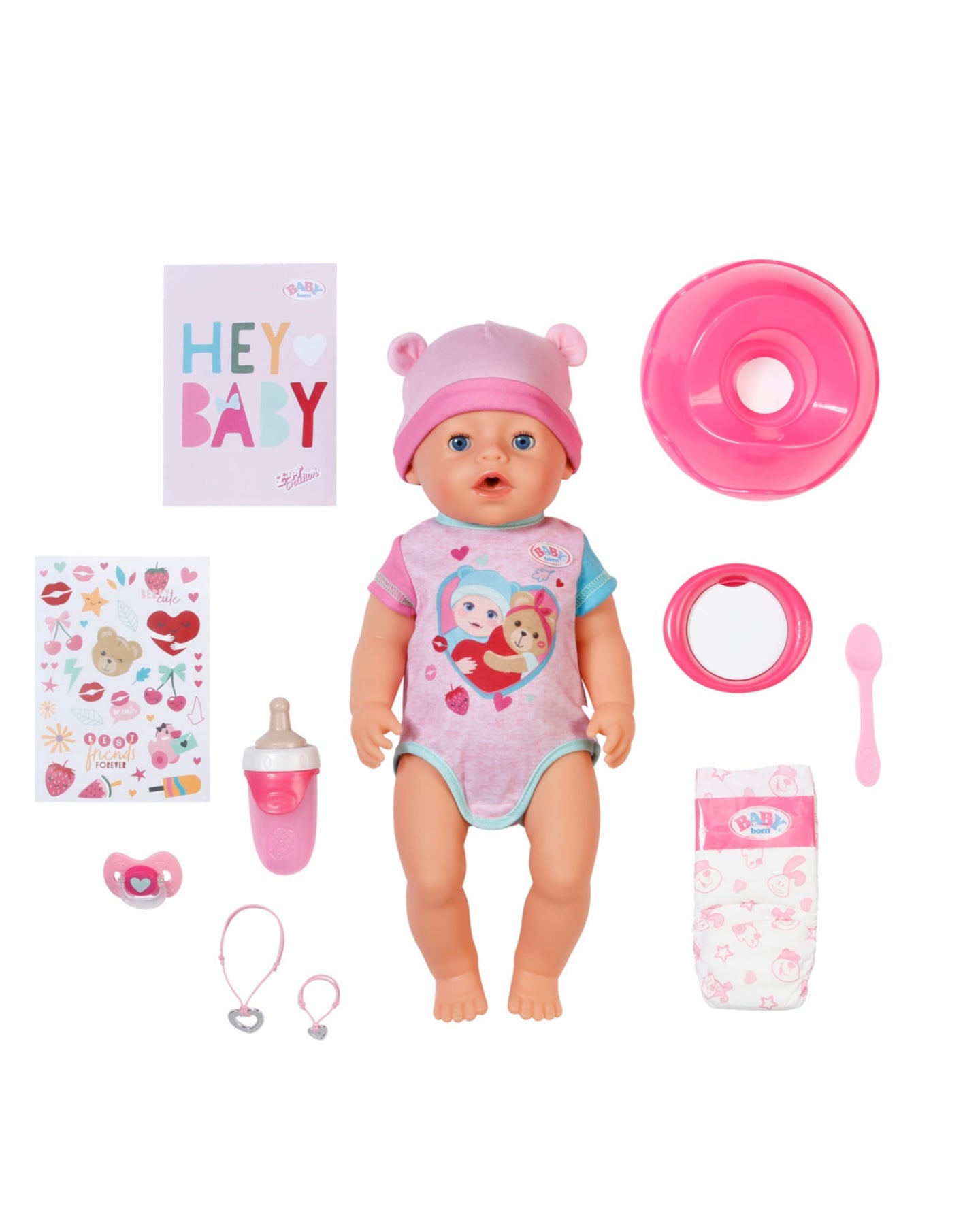 Hier kommt Emma! Bereits bekannt aus der BABY born Animationsserie, welche auf YouTube und Toggo zu sehen ist, gibt es Emma jetzt auch in ihrem neuen Outfit und mit 10 Accessoires für euch zu Hause. Mit dabei hat sie auch ihren magischen Teller: gibt man Wasser auf die Einlege-Fläche im Teller, erscheinen dort durch den Wasserzauber leckere Gerichte, die das Fütterspiel noch spannender machen. Setzt man sie nach dem gespielten Essen (mit Wasser) oder Trinken auf ihr Töpfchen und drückt ihr auf den Bauch, erscheinen auch dort ihr kleines und ihr großes Geschäft. Trinkt Emma Wasser aus ihrem Fläschchen, kann sie sogar weinen und muss behutsam getröstet werden. Dabei hilft der magische Schnuller: dreht man ihn um 180 Grad, schließen oder öffnen sich ihre Augen. Nochmal gedreht und das Gegenteil passiert. Legt man sie zum Schlafen ins Bettchen, schließt sie ihre Augen auch ohne Schnuller. Doch Emma kann noch viel mehr: Sie ist super beweglich und kann sogar mit in die Badwanne genommen werden, denn sie trocknet jetzt noch schneller: Um die Puppe nach dem Spiel richtig zu reinigen, kann das Bein entfernt werden, um eine größere Öffnung für die Reinigung zu schaffen. Wasser kann so viel einfacher abfließen. Für noch mehr kreatives Spiel bringt Emma neben ihrem Fläschchen, Schnuller, Teller, Löffelchen, Mahlzeiten und Töpfchen auch noch eine Windel, ihren Geburtspass und zwei Freundschaftsarmbändchen mit – für eine lange und liebevolle Freundschaft zwischen Kind und Puppe. In der gewohnten BABY born Qualität, die Generationen von Kindern seit 1991 begeistert.