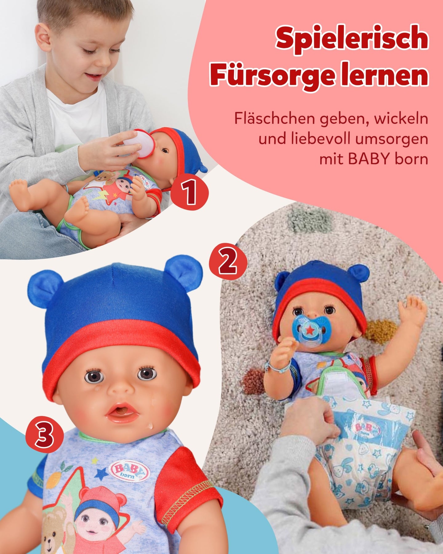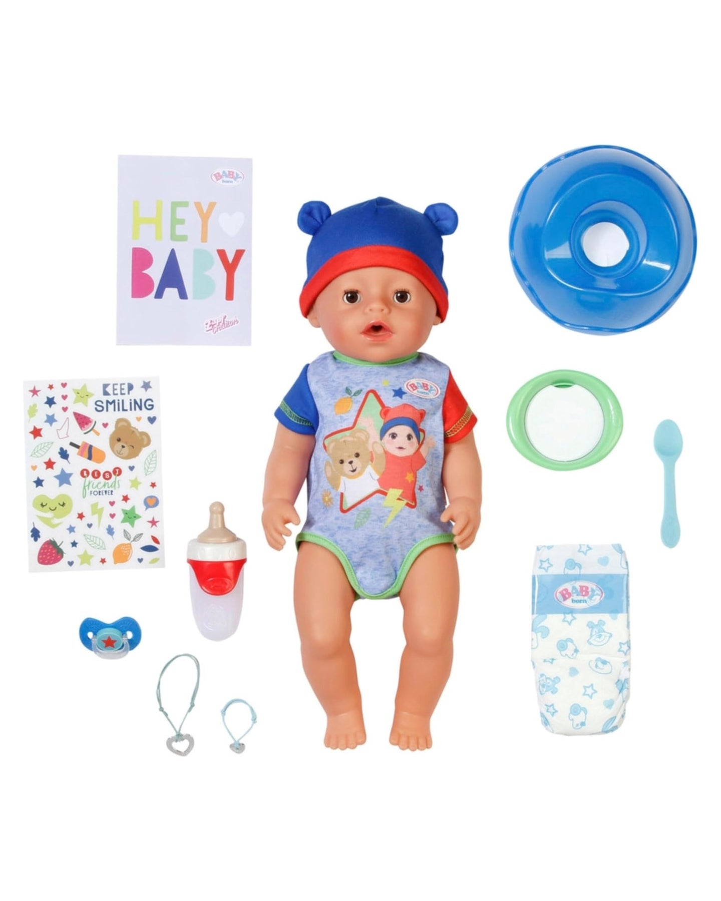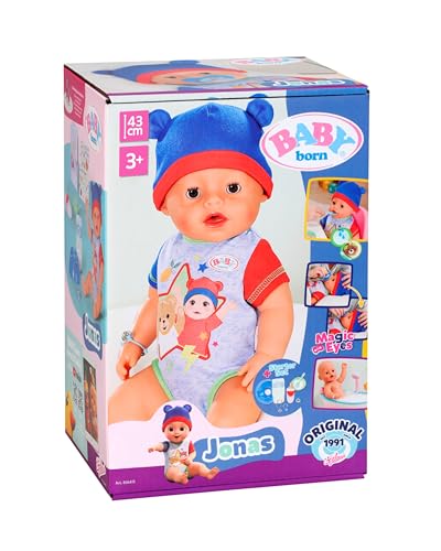 Hier kommt Jonas! Bereits bekannt aus der BABY born Animationsserie, welche auf YouTube und Toggo zu sehen ist, gibt es Jonas jetzt auch in seinem neuen Outfit und mit 10 Accessoires für euch zu Hause. Mit dabei hat er auch seinen magischen Teller: gibt man Wasser auf die Einlege-Fläche im Teller, erscheinen dort durch den Wasserzauber leckere Gerichte, die das Fütterspiel noch spannender machen. Setzt man ihn nach dem gespielten Essen (mit Wasser) oder Trinken auf ihr Töpfchen und drückt ihm auf den Bauch, erscheinen auch dort sein kleines und ihr großes Geschäft. Trinkt Jonas Wasser aus seinem Fläschchen, kann er sogar weinen und muss behutsam getröstet werden. Dabei hilft der magische Schnuller: dreht man ihn um 180 Grad, schließen oder öffnen sich seine Augen. Nochmal gedreht und das Gegenteil passiert. Legt man ihn zum Schlafen ins Bettchen, schließt sie ihre Augen auch ohne Schnuller. Doch Jonas kann noch viel mehr: Er ist super beweglich und kann sogar mit in die Badwanne genommen werden, denn er trocknet jetzt noch schneller: Um die Puppe nach dem Spiel richtig zu reinigen, kann das Bein entfernt werden, um eine größere Öffnung für die Reinigung zu schaffen. Wasser kann so viel einfacher abfließen. Für noch mehr kreatives Spiel bringt Jonas neben seinem Fläschchen, Schnuller, Teller, Löffelchen, Mahlzeiten und Töpfchen auch noch eine Windel, seinem Geburtspass und zwei Freundschaftsarmbändchen mit – für eine lange und liebevolle Freundschaft zwischen Kind und Puppe. In der gewohnten BABY born Qualität, die Generationen von Kindern seit 1991 begeistert.