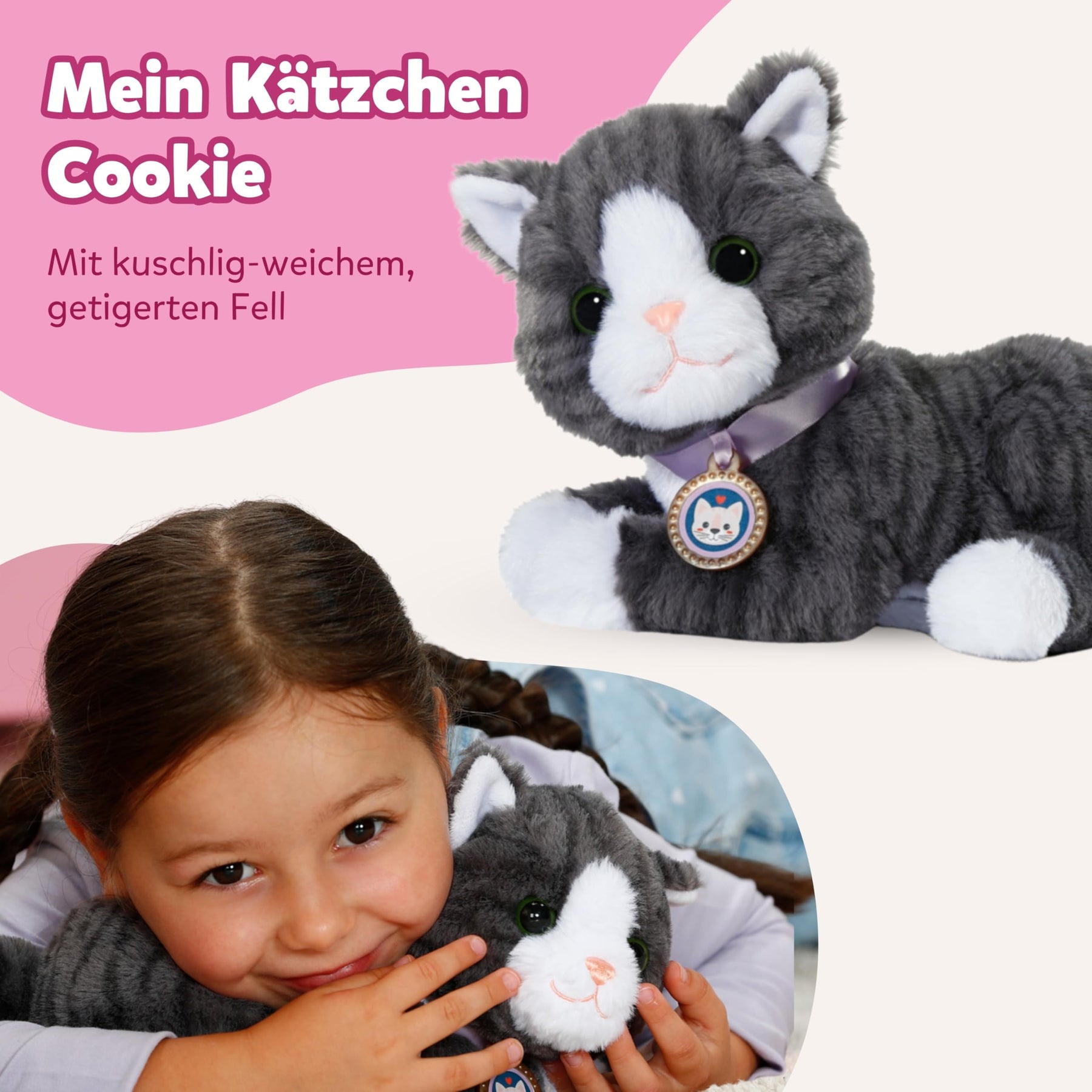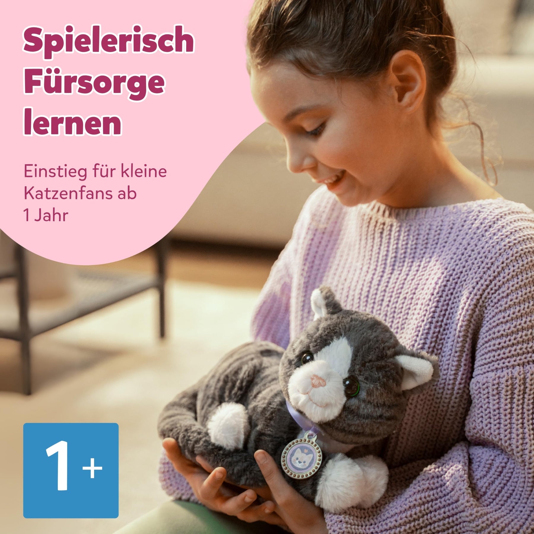 Die BABY born Haustierfamilie bekommt Zuwachs: Grau getigertes Fell, große, grüne Augen und ein niedliches rosa Näschen - Cookie ist ein richtiges Schmusekätzchen. Streichelt man das elektronische Kätzchen am Kopf, Rücken oder an den Pfötchen, beginnt es zu miauen und zu schnurren. Der ganze Körper vibriert dabei sanft - fast wie bei einem echten Kätzchen. Wird gerade nicht mit Cookie geschmust, macht sie es sich in ihrem Körbchen bequem - ein Ort, der sowohl Rückzugsort als auch Transportbox ist. Ob sie sich wohl gut mit BABY born Mein Hund Lucky verstehen wird?