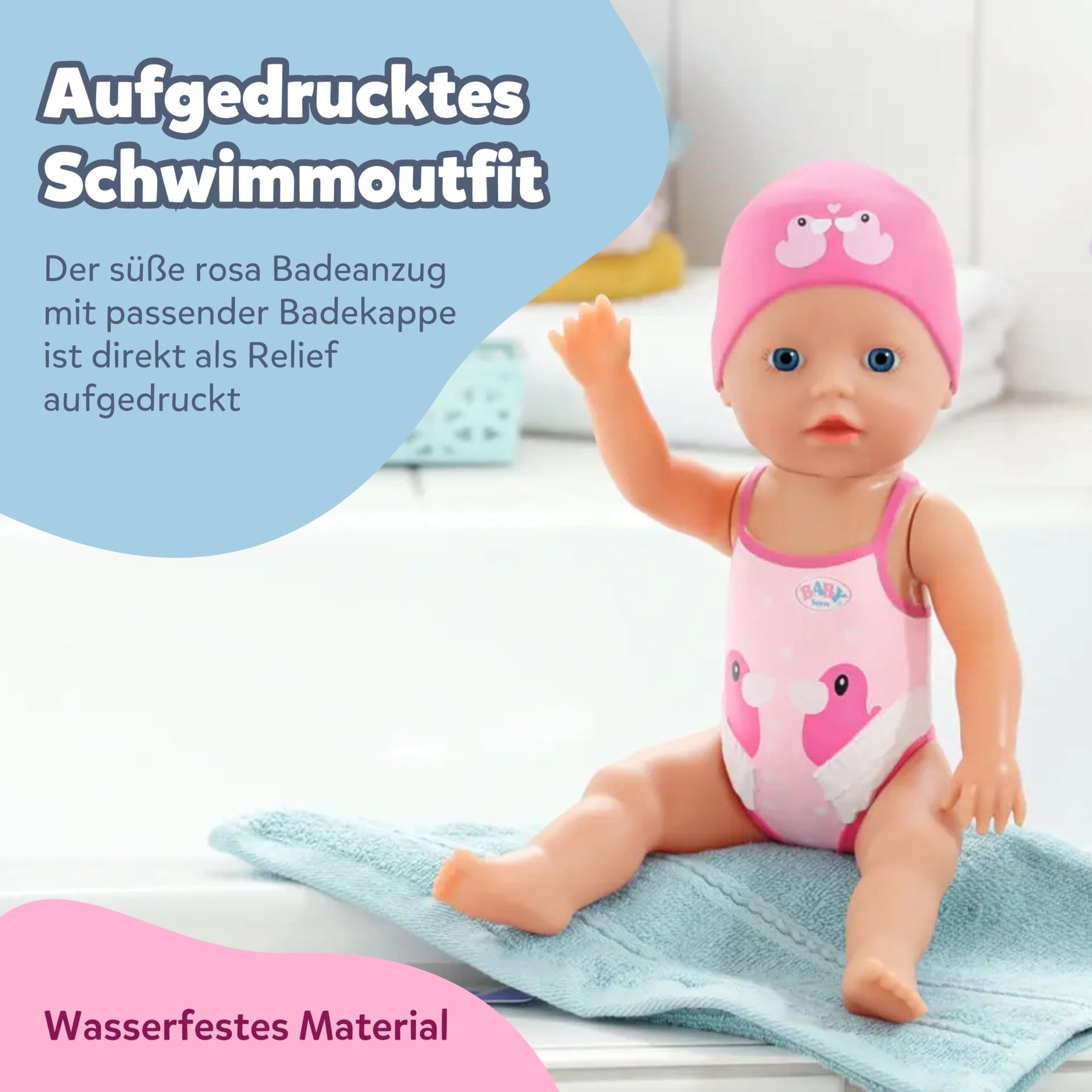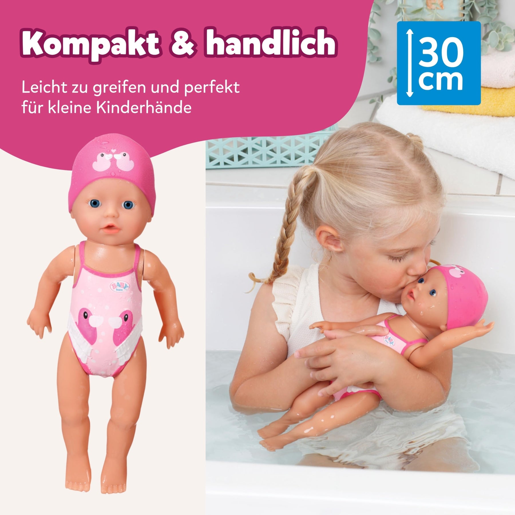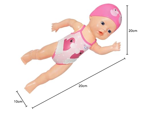 Baby Born Mädchen 1. Schwimmerin: Drehen Sie die Arme der Schwimmerpuppe um, tauchen Sie sie ins Wasser und sehen Sie ihr beim Kraulen oder Schmetterlingsschwimmen zu. Die 30 cm große Puppe hat einen Badeanzug und eine geschnitzte Kappe in niedlichen Farben und Mustern.