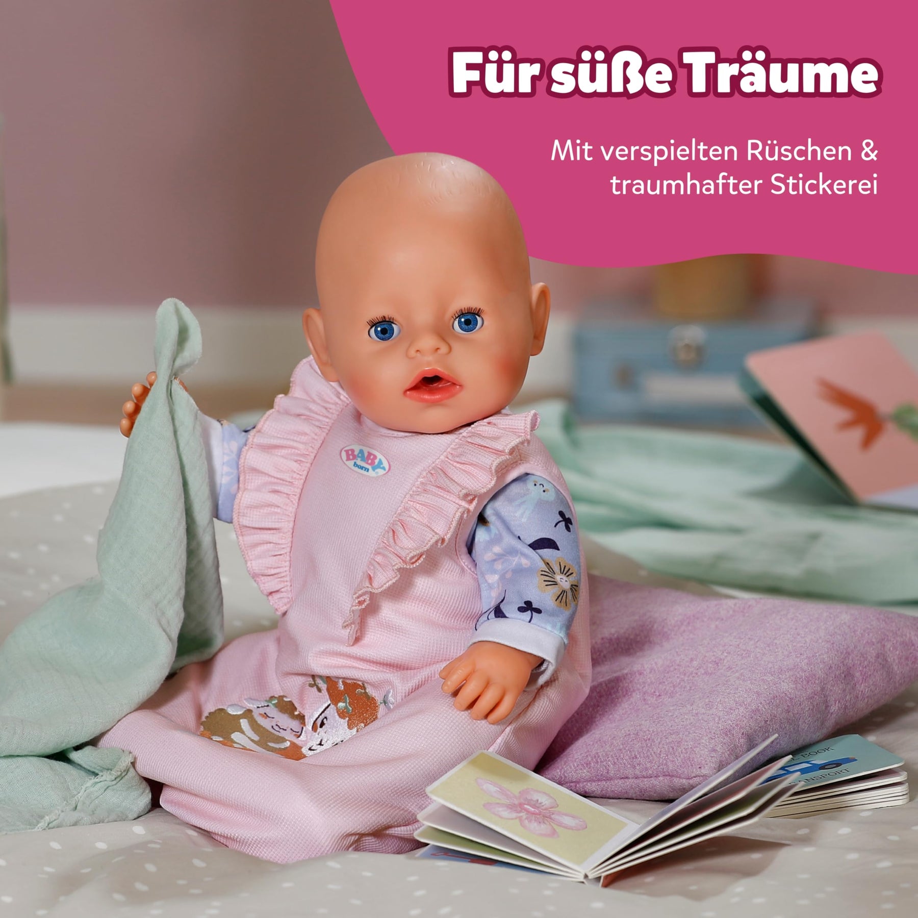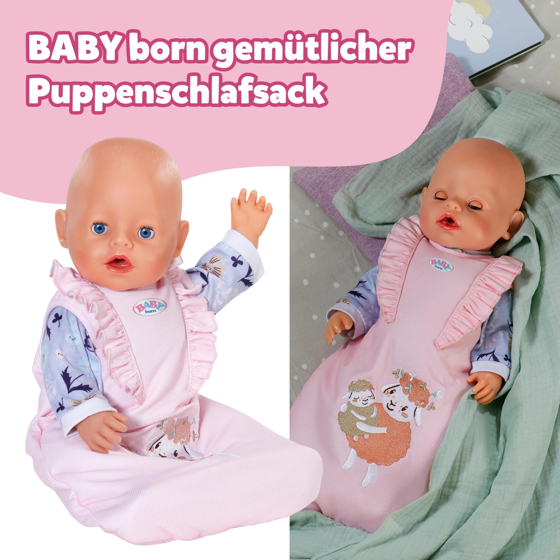 BABY born Puppenschlafsack - Rosa Schlafsack mit Rüschen & Klettverschluss - Hochwertiges Puppenzubehör - Geeignet für alle 36 cm & 43 cm Puppen
