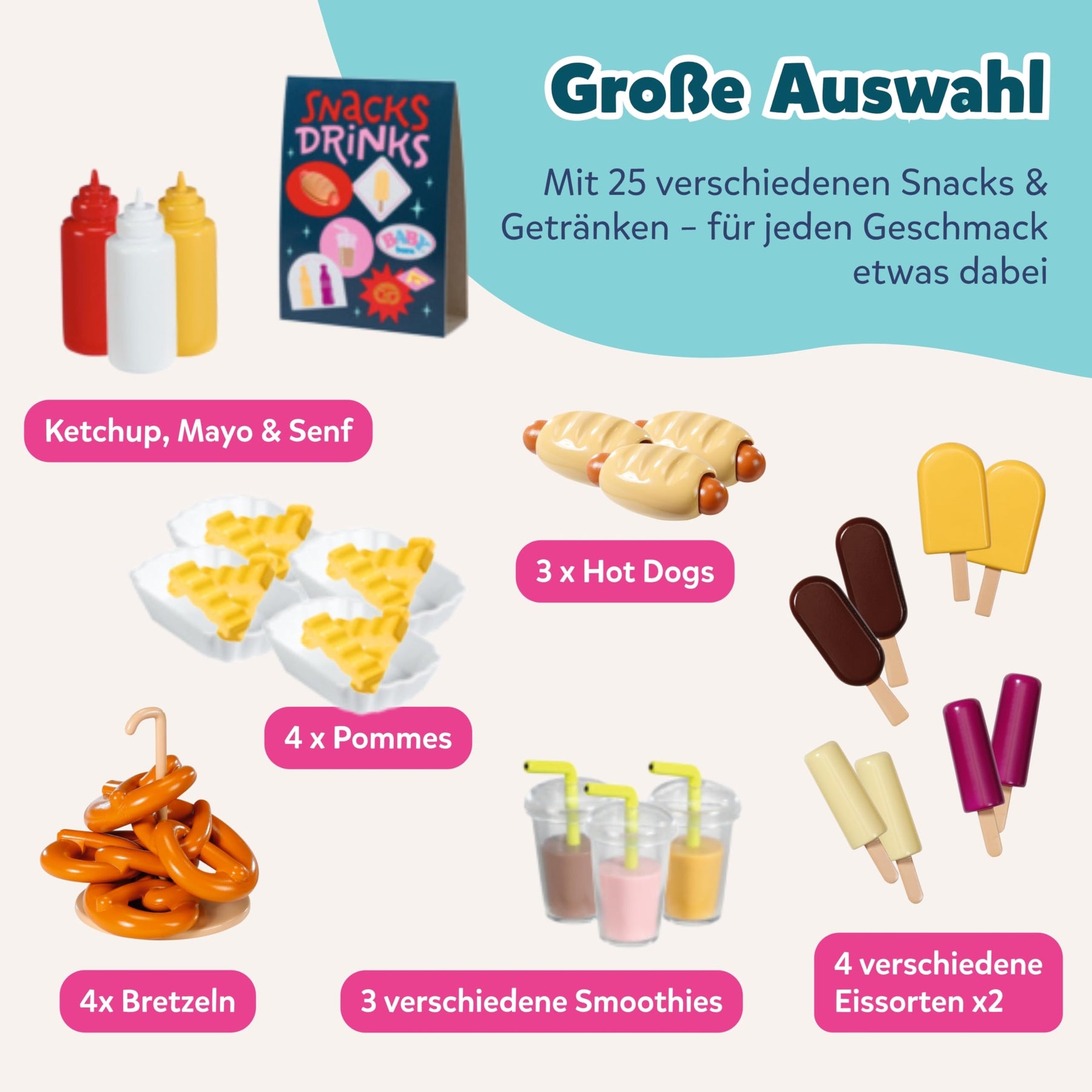 - FÜR JEDEN GESCHMACK ETWAS DABEI - Der BABY born Snack Shop begeistert mit 25 leckeren Snacks & Getränken: Von Pommes, über Hotdogs, Bretzeln & Eis, zu vielen weiteren.