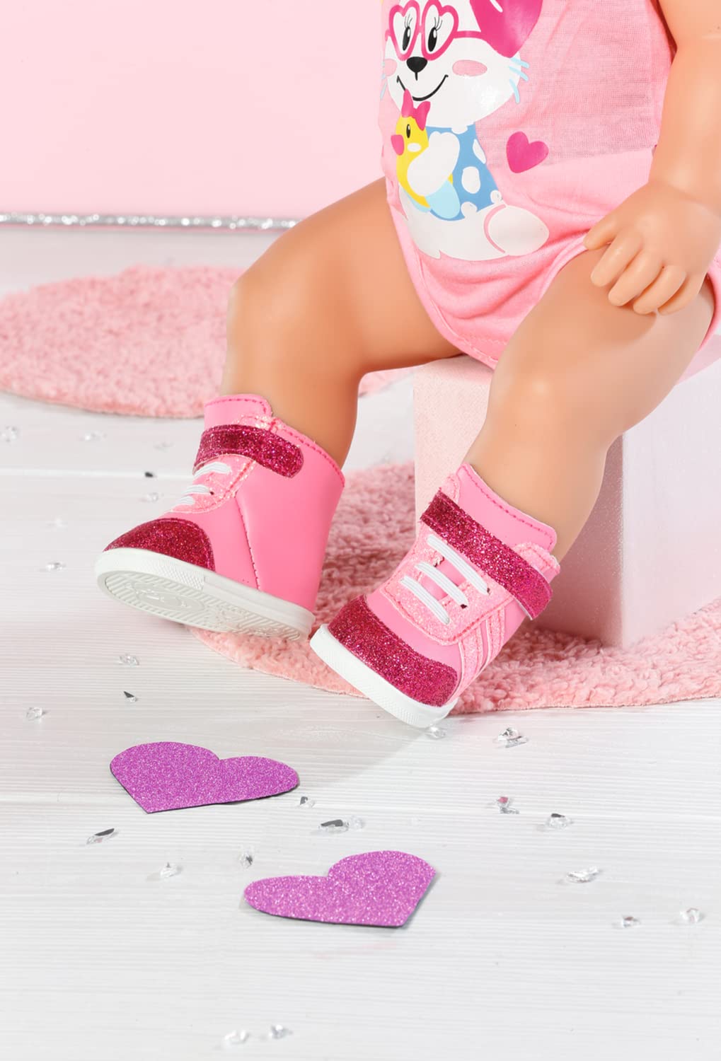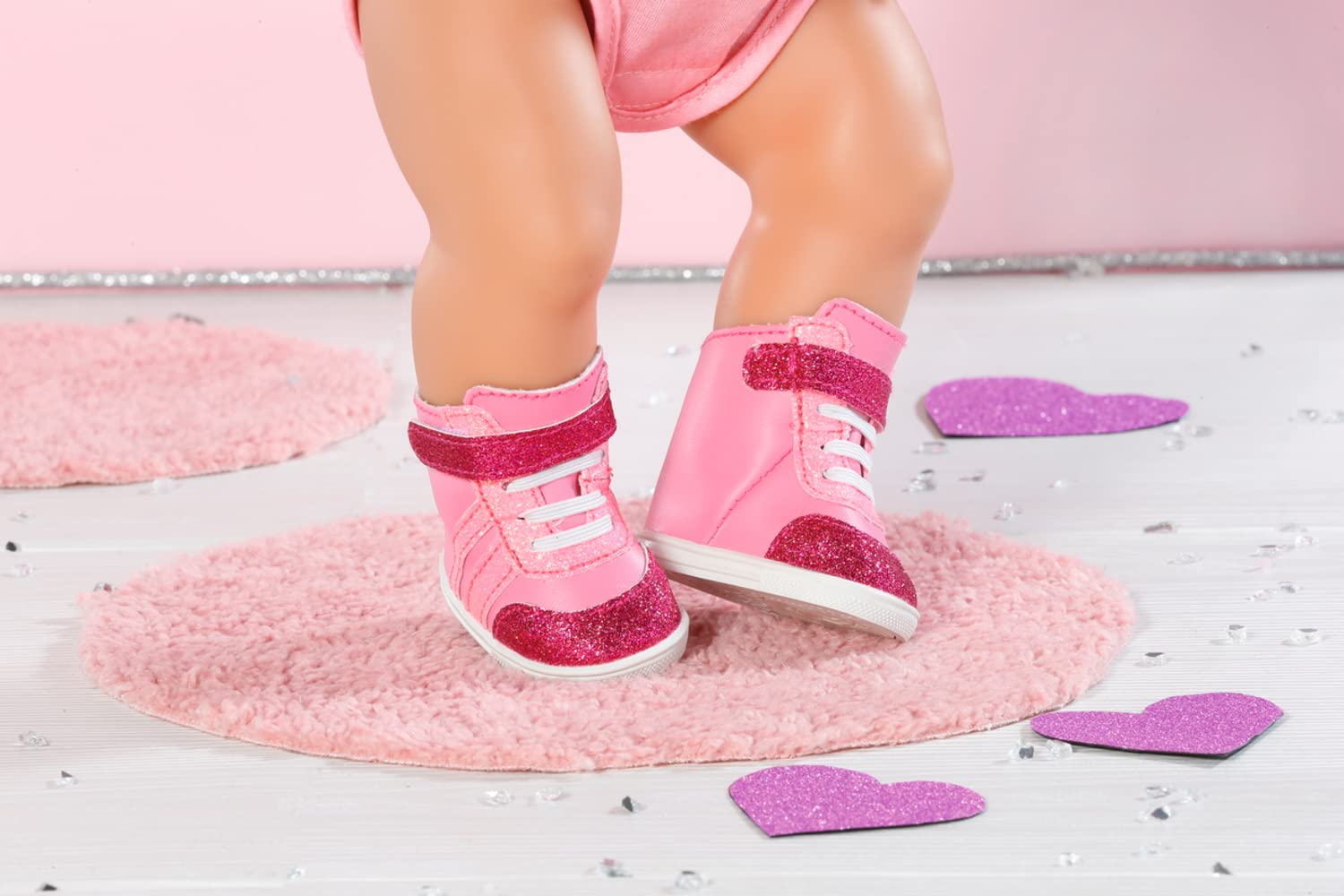Einzelheiten: BABY born schleicht seit neustem wie ein kleiner pinker Panther durchs Kinderzimmer. Die leisen Sohlen, sowie die weißen Schnürsenkel harmonieren prima mit der Farbgebung der Turnschuhe. Die Sneakers sind Ton in Ton in Rosa gehalten. Das Schuhmaterial, die Streifen, das Klettband und die Fußspitzen weichen nur in Nuancen voneinander ab. Natürlich darf ein bisschen Glitzer auf dem Pink nicht fehlen. Die Schuhe sind knöchelhoch und geben der kleinen Entdeckerin sicheren Halt auf ihren Streifzügen. Hochwertige Kleidung für die BABY born Markenspielpuppe. Für erweitertes, abwechslungsreiches und langanhaltendes Spielvergnügen. BABY born Sneakers pink 43cm.