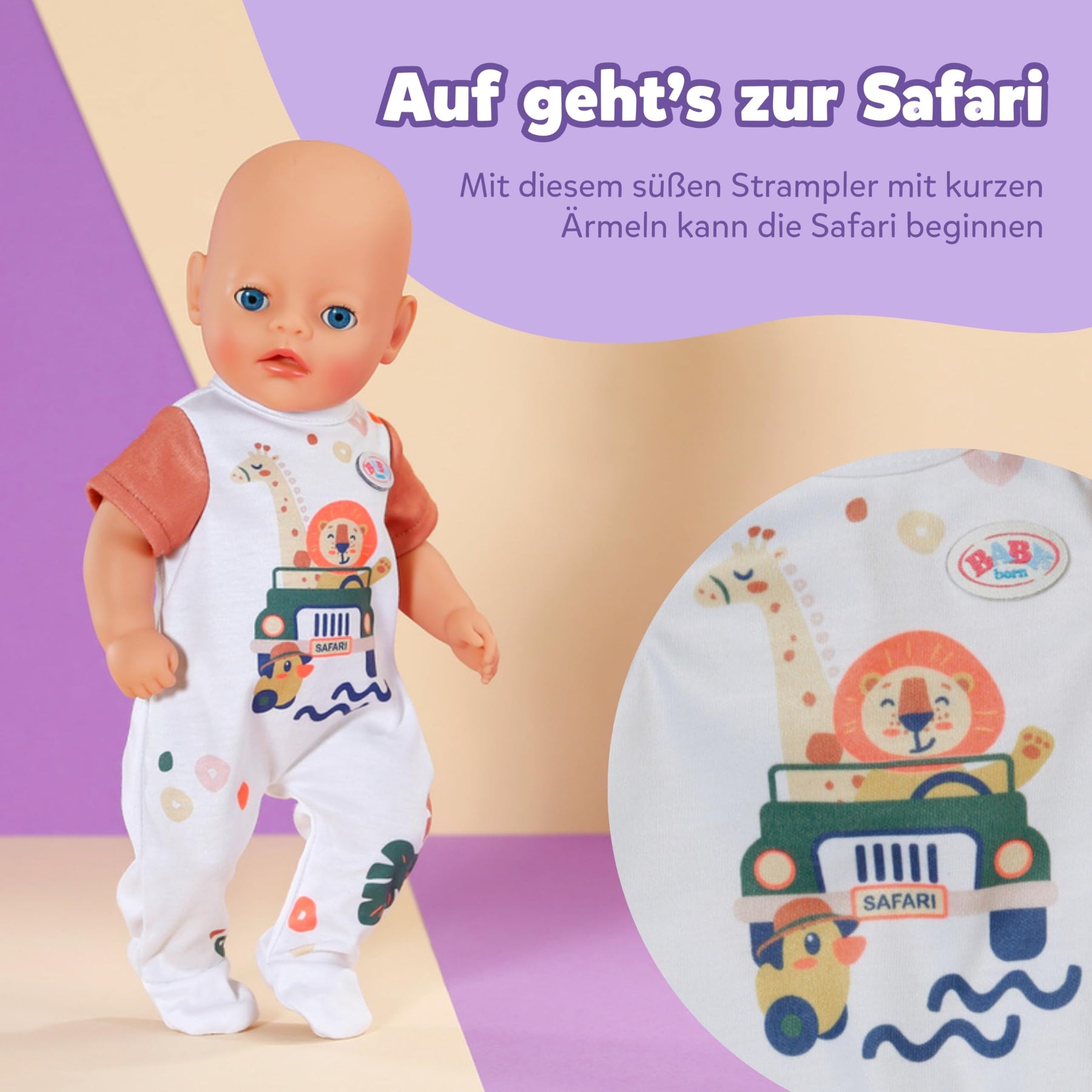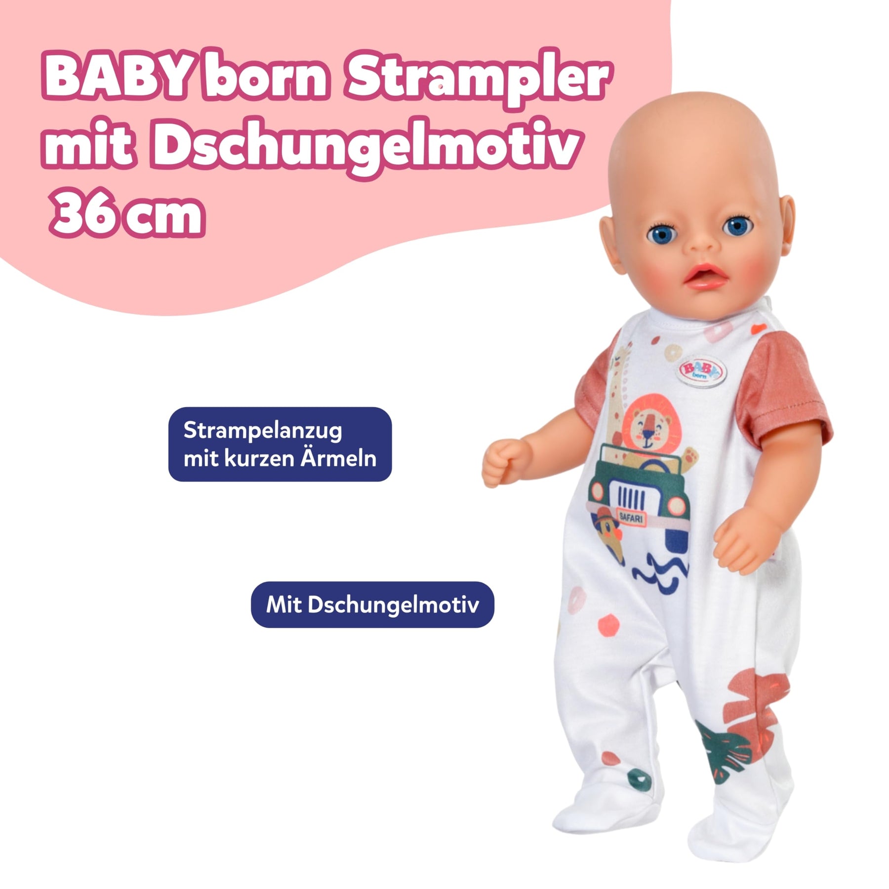 - LUST AUF SAFARI - Der Strampler mit seinem niedlichen Dschungelmotiv & den kurzen Ärmeln bringt exotische Abwechslung in den Puppenkleiderschrank von BABY born.