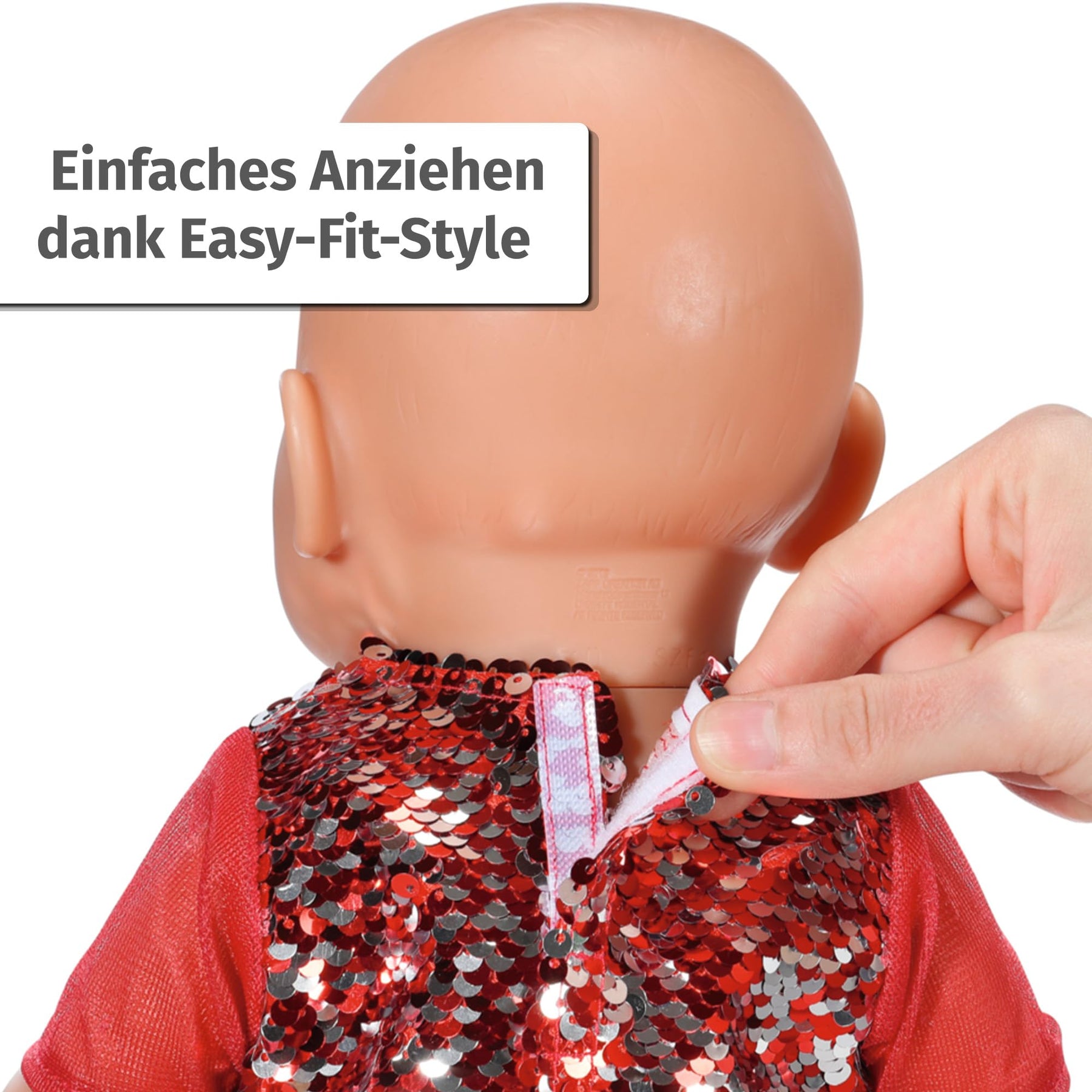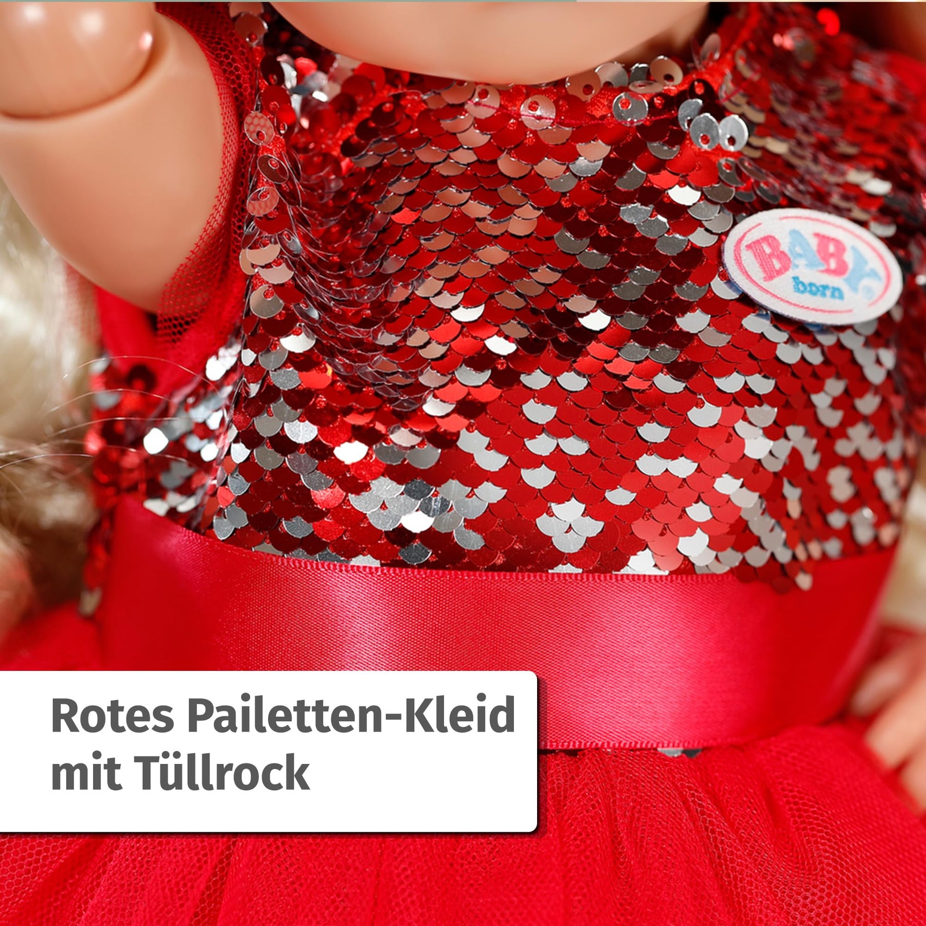 In der Weihnachtszeit und zu den Weihnachtsfeiertagen kleidet sich BABY born gern angemessen. Was wäre da besser als ein rotes Pailetten-Kleid mit Tüllrock, eine silberne Leggins und einer Mütze gegen kalte Ohren?