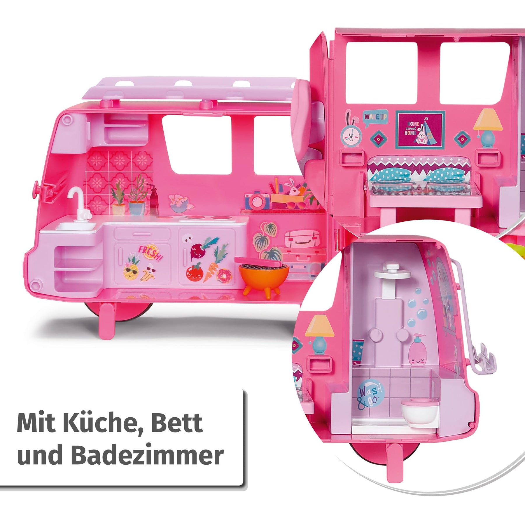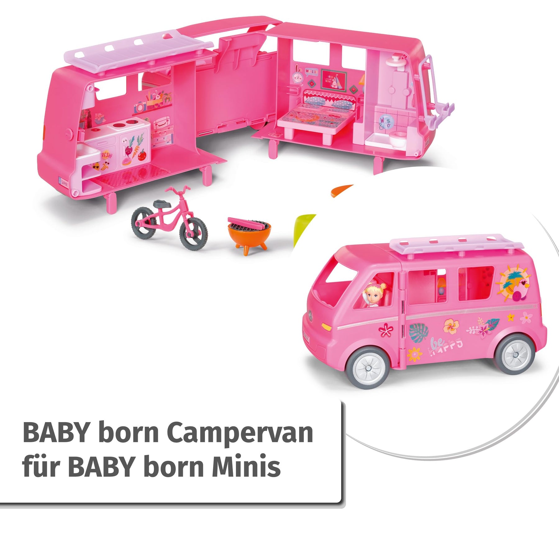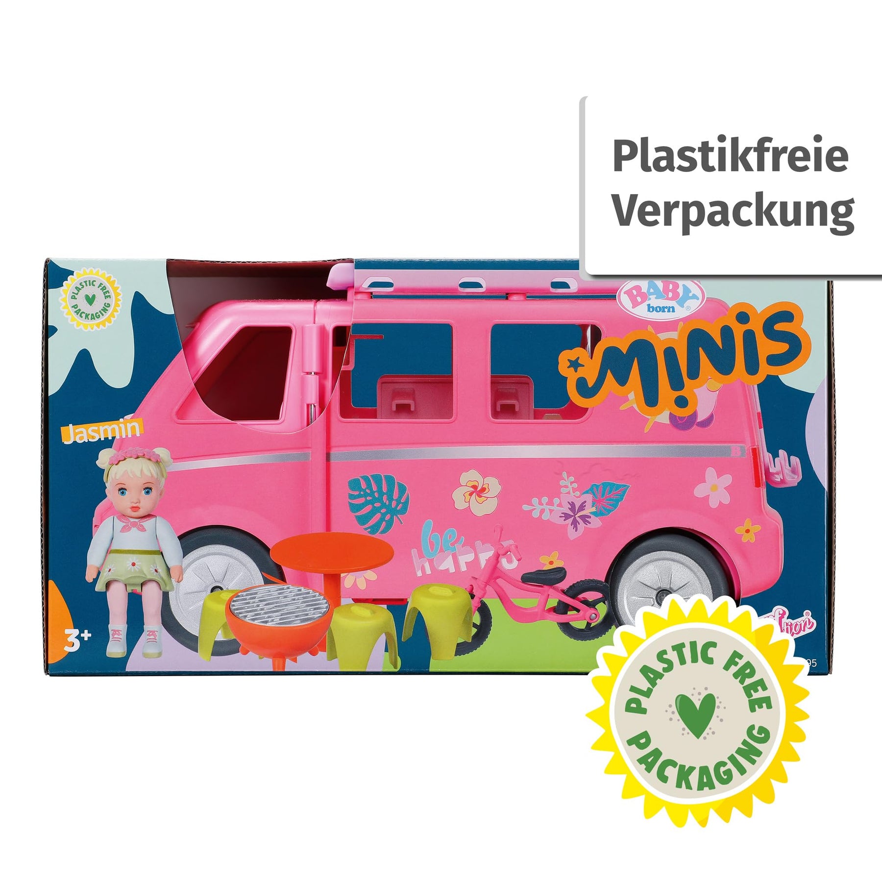 Jasmin liebt es, mit ihrem Campervan auf Reisen zu sein. Mit dem voll ausgestatteten Bus kann sie überall dort übernachten, wo es ihr gerade gefällt. Der knallpinke Van verfügt über eine Küche, ein Doppelbett und sogar ein voll ausgestattetes Puppenbadezimmer im Inneren. Als Extra gibt es auch noch drei Campingstühle, einen Tisch, ein Fahrrad und einen Grill, die alle im aufklappbaren Camper Platz finden. • BABY born Minis Campervan • Inkl. BABY born Minis Puppe Jasmin und vielen Accessories • Campervan kann mit Aufklebern dekoriert werden