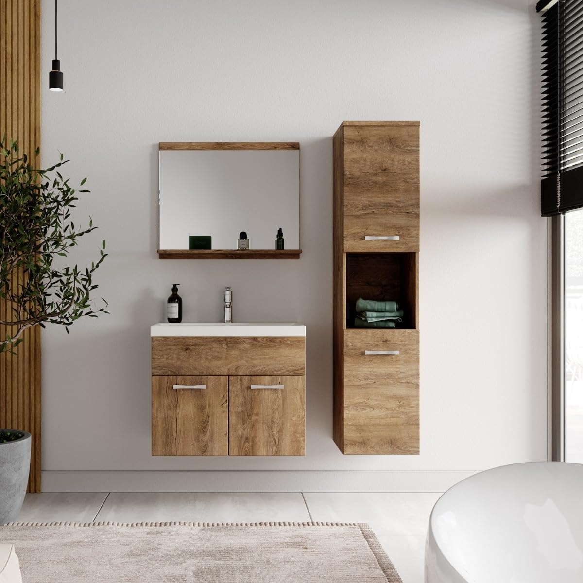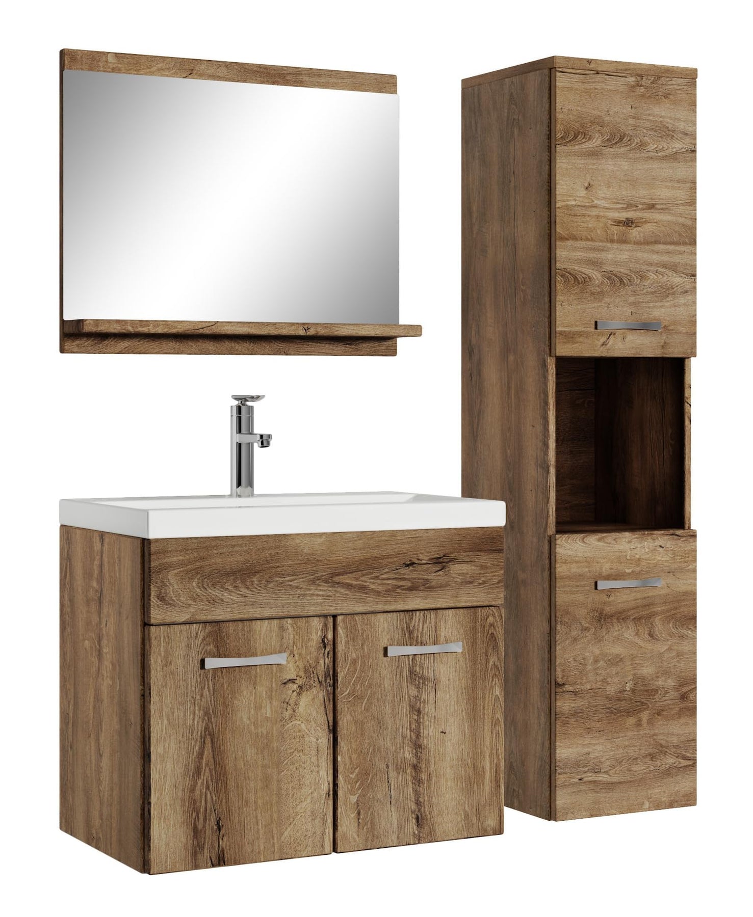 Dieses Set besteht aus einem Waschbecken, einem Waschbeckenunterschrank, einem Hochschrank sowie einem Spiegel.