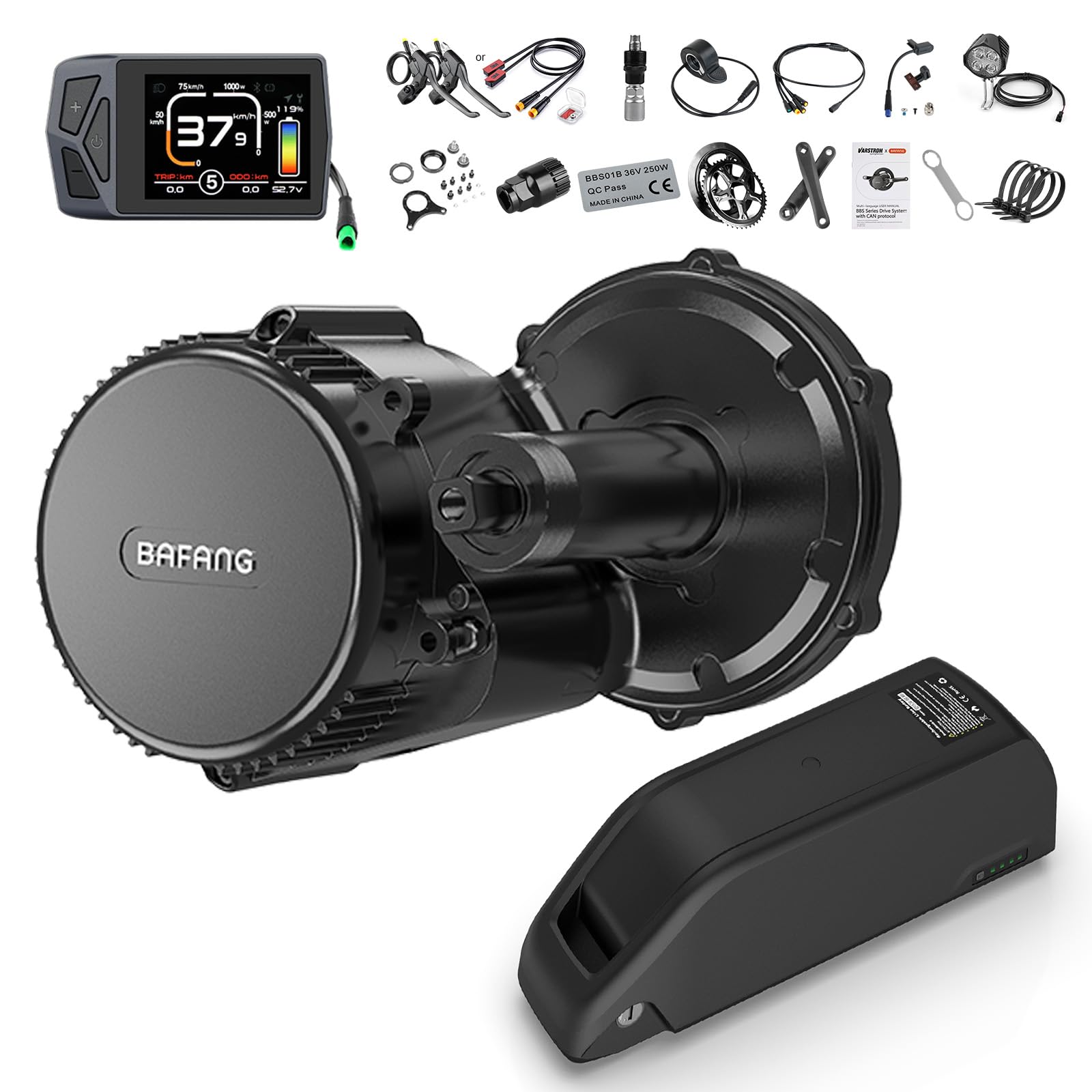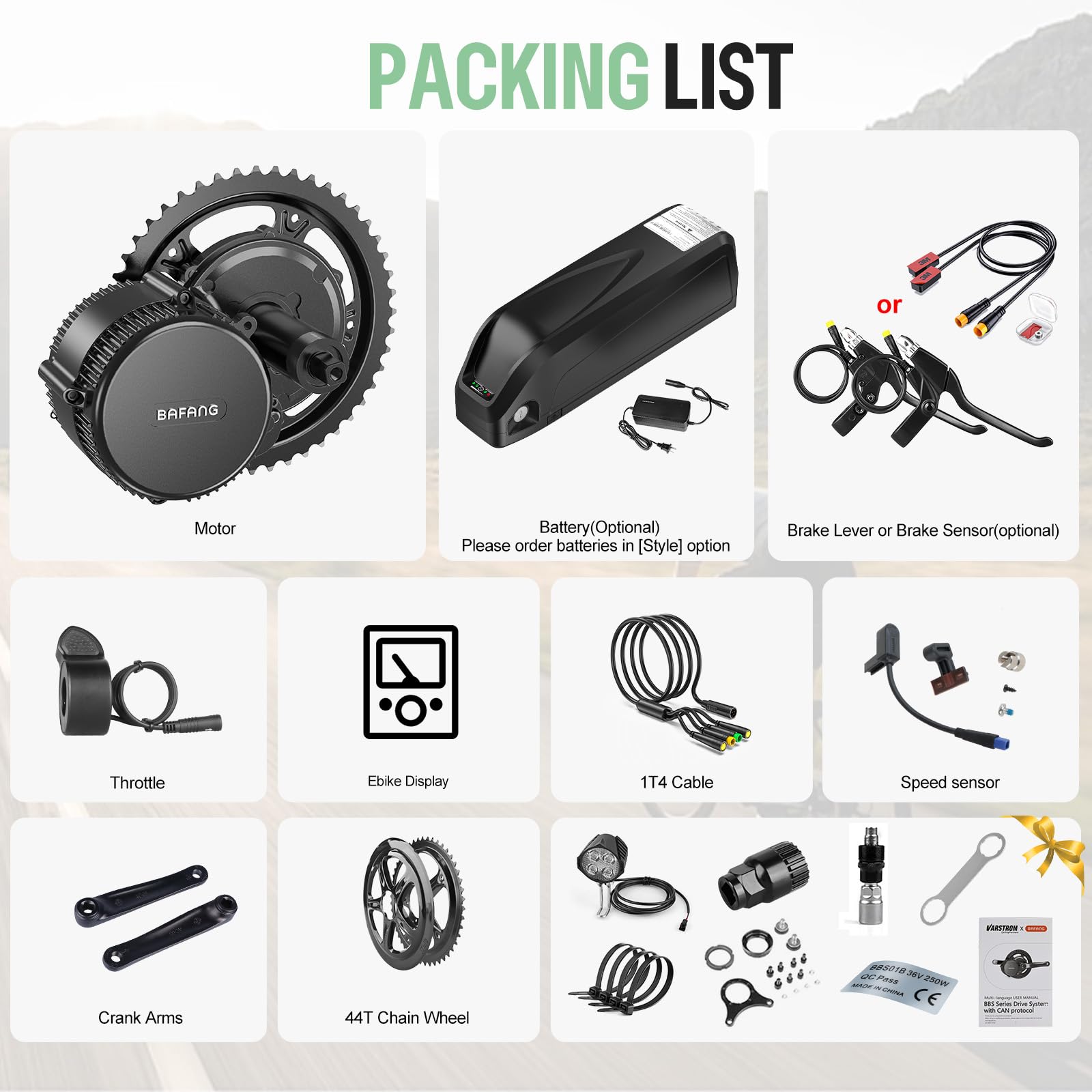 Lieferumfang:Das Paket enthält folgende Komponenten:750W Mittelmotor,Display,44T Kettenblatt mit Schutz,Geschwindigkeitssensor und Magneten,Hydraulischer Bremssensor (Standard),Kurbeln,1T4 EB-BUS-Kabel,Daumengashebel,Kabelbinder,Montagewerkzeuge,Frontscheinwerfer,Falls Sie Unterstützung benötigen, kontaktieren Sie uns bitte umgehend für eine schnelle Lösung