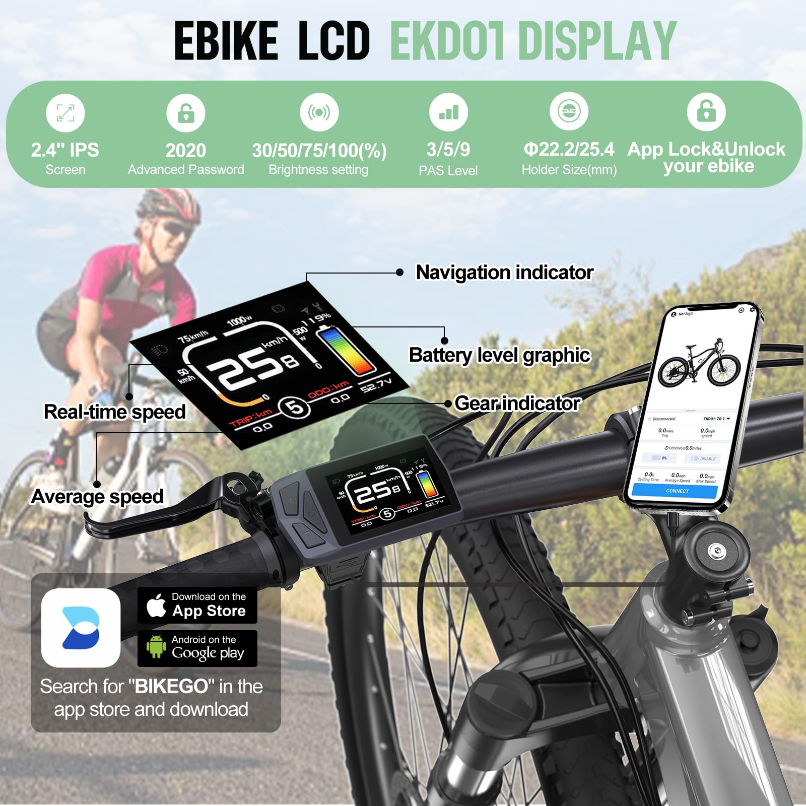 EKD01 LCD-Display:Ausgestattet mit 9 Spracheinstellungen, Navigationsfunktionen und einem Typ-C-Ladeanschluss, passt es zu Lenkern mit Ø22,2/25,4 mm. Im Vergleich zu anderen Modellen kann der Kilometerzähler (ODO) auf null zurückgesetzt werden. Das EKD01-Display kann die Navigationsoberfläche spiegeln, wenn es über die "BIKEGO"-App verbunden ist. Das EKD01 ist eine gute Wahl für Radfahrer, die viele Funktionen zu einem begrenzten Budget suchen