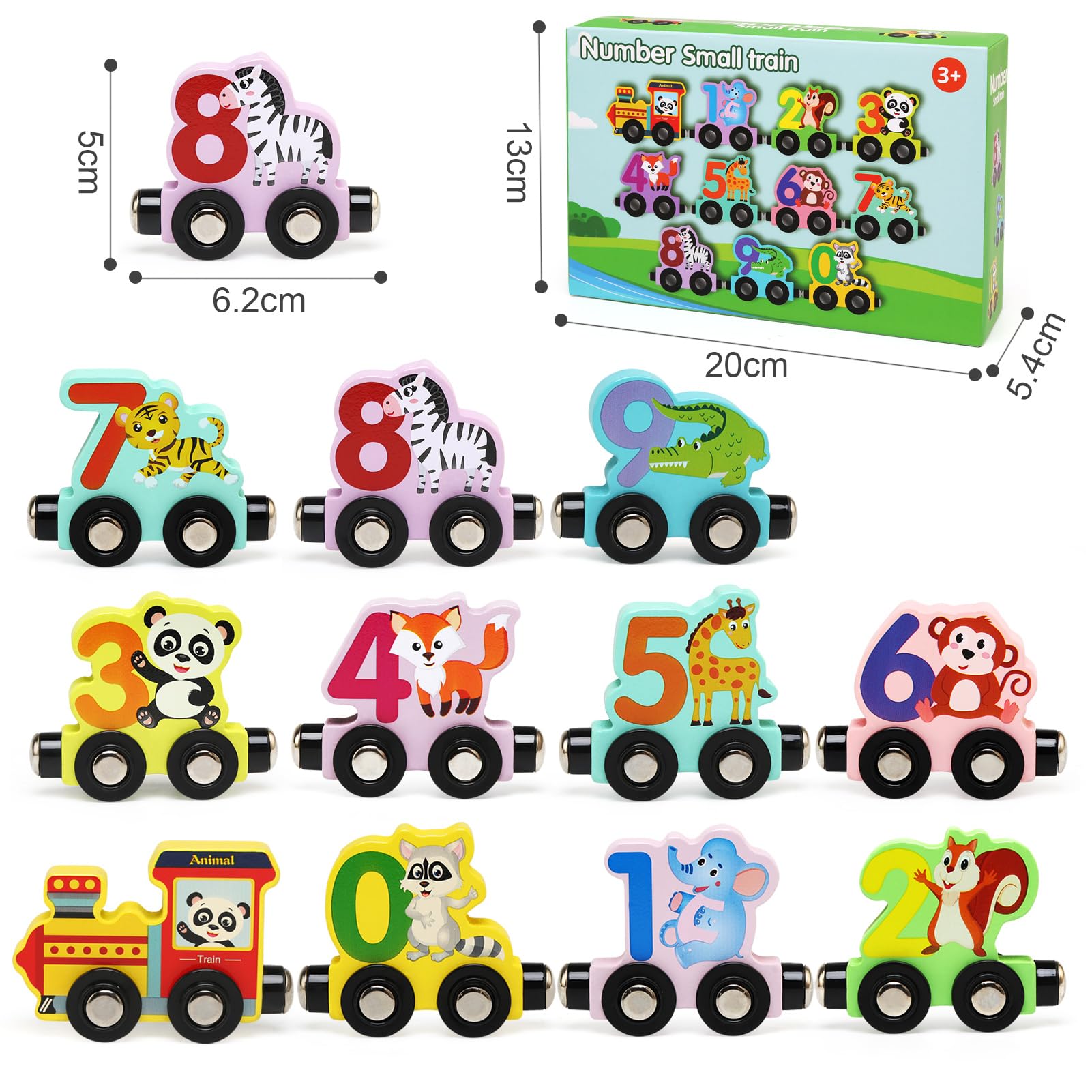 - 🚂Holz-Zahleneisenbahn-Set – 11-teilig: Niedliche Züge in Tierform sind da! Unser Holzeisenbahn-Set enthält eine Lokomotive und 10 Tier-Zugwaggons mit einem Tier-Aufdruck auf beiden Seiten und den Zahlen 0-10.